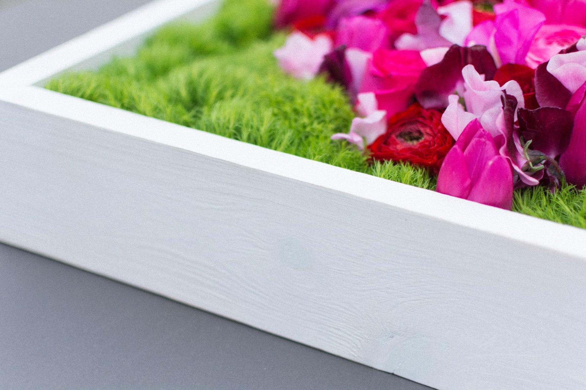 A lush medley of hot pink florals in full bloom, this romantic, heart shaped design features delicate Ranunculus, Sweet Peas, Roses, Tulips, and Vanda orchids all set in vibrant green moss. The Blooming Heart is set in a 16 inch square, hand-painted white wooden box.