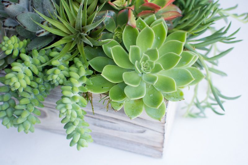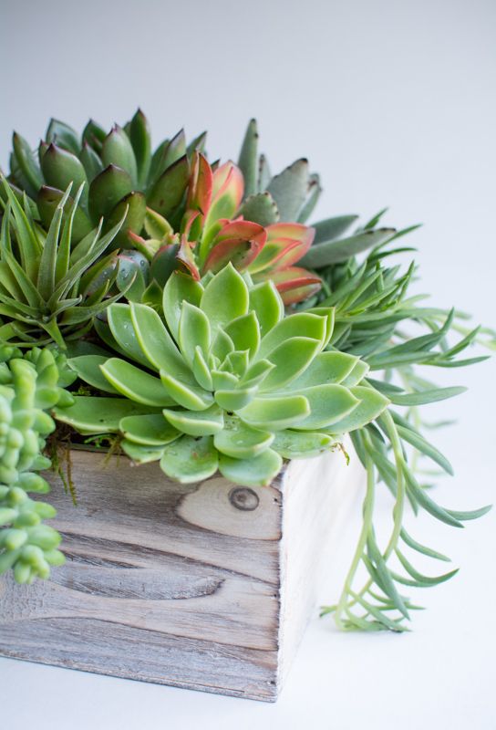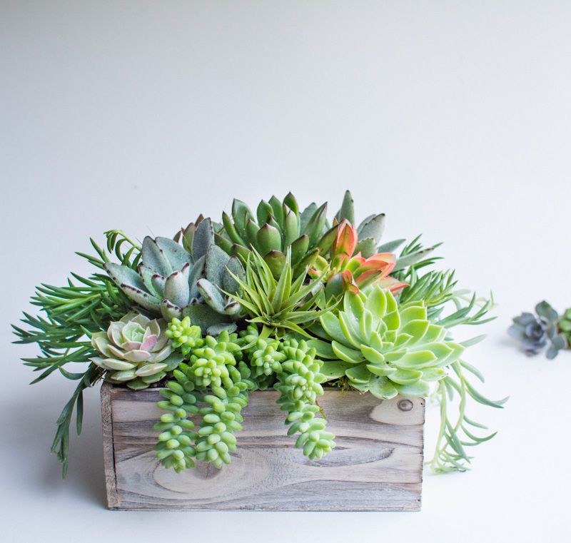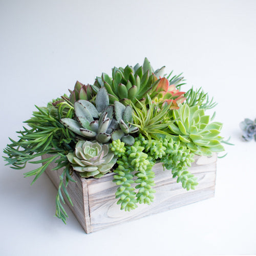 Answer the Call of the Wild with this vibrant, earthy design. A lush assortment of effervescently green, hand-selected succulents spill out from the white washed wooden box they rest in. The handcrafted box measures 5" by 12", and the arrangement stands at 10" tall overall.
