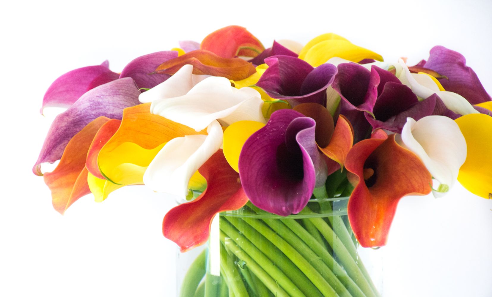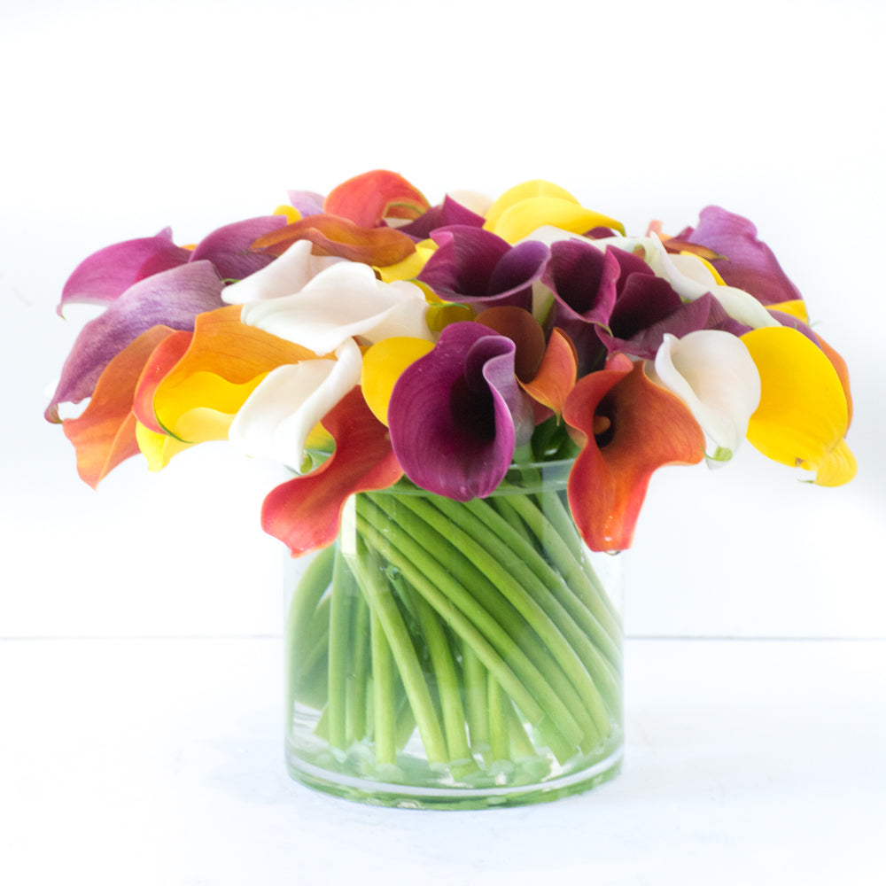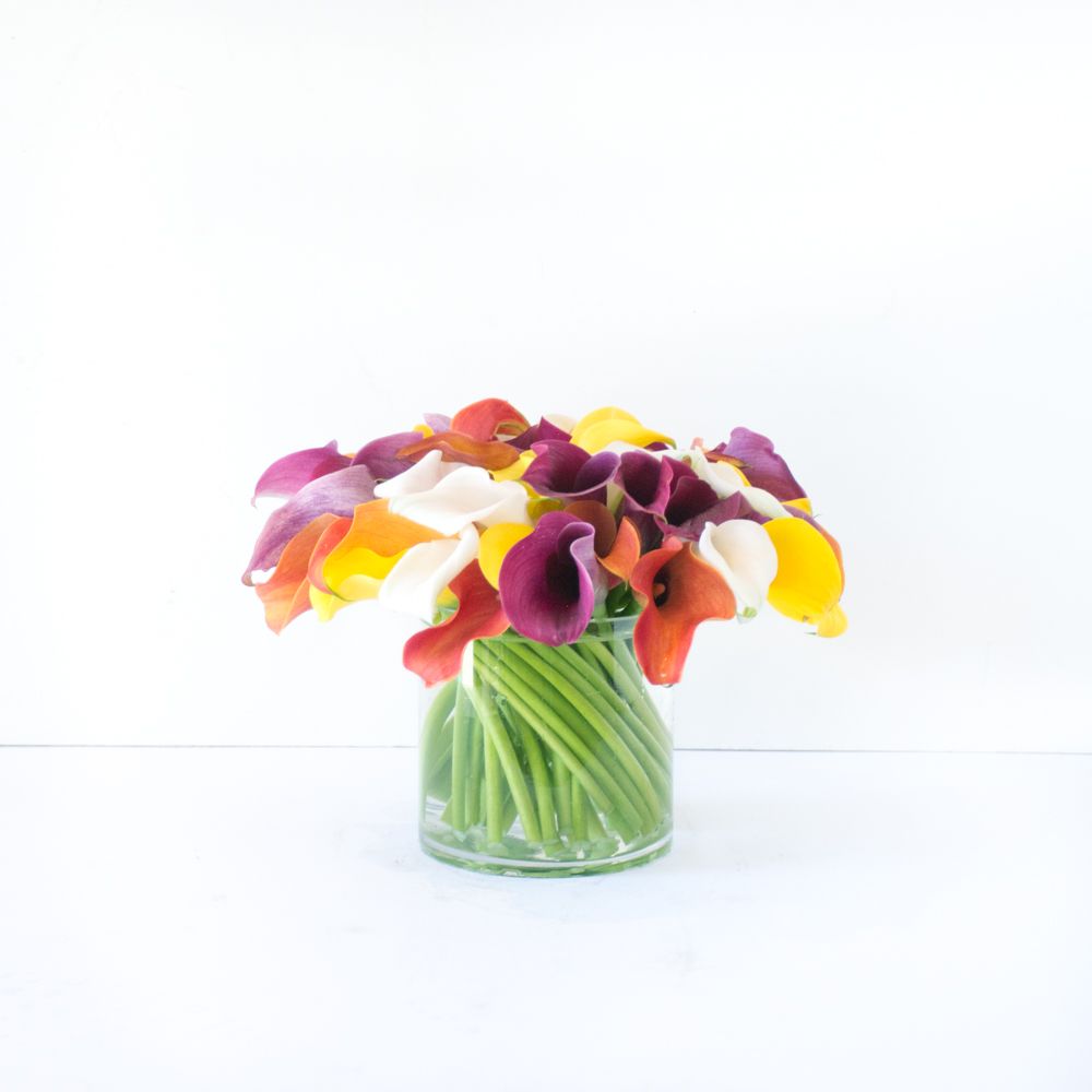 This modern and stunning floral design is as serene as it is beautiful. A myriad of colors from yellow to purple is shown in 30 calla , twining together with stems submerged in an 5” X 5” tall glass vase. Overall this arrangement stands around 7” tall.