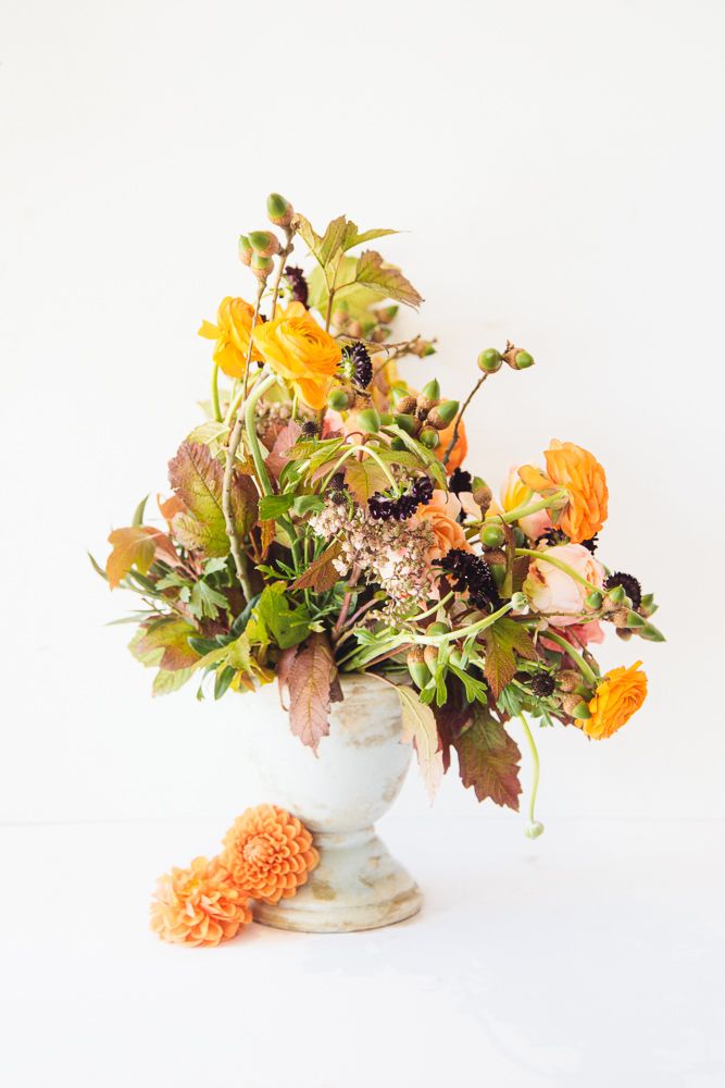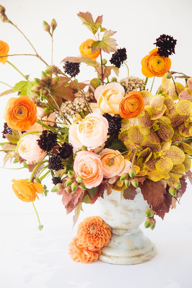 Exotic and bold, this floral design is sure to enchant any room. Yellow spotted vanda orchids contrast the dark purple scabiosa and peach tone roses. Vibrant orange ranunculus are placed throughout, with autumn foliage adding the final touch. This arrangement rests inside a rustic 10” ceramic vase.