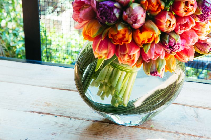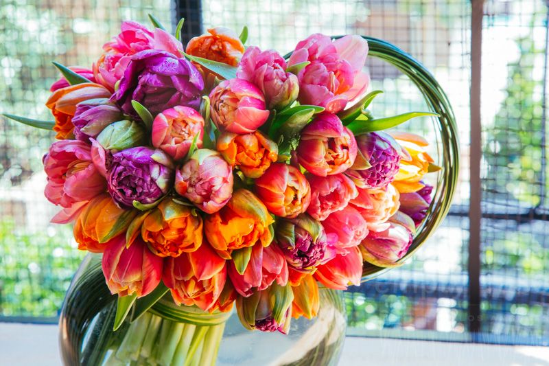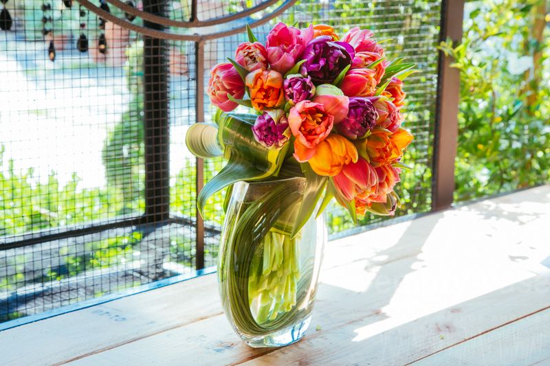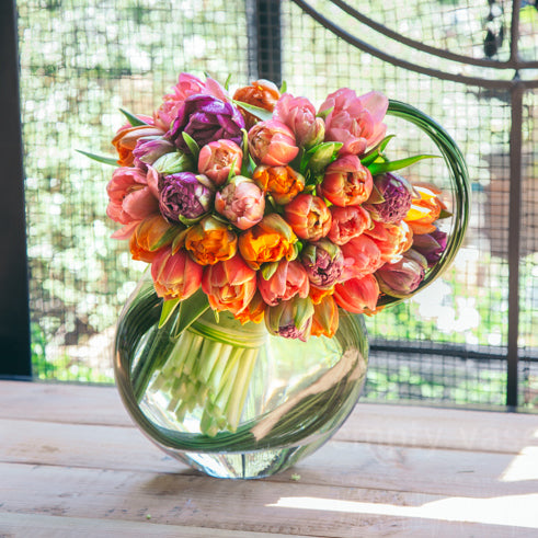 This vibrant tulip arrangement offers an exquisite selection of spring colors and modern design. 40 stunning Dutch tulips are gathered together in shades of pink, purple and orange. Steel grass shapes to one side of the blooms and the interior lining of the 8” by 10” circular glass vase. Tropical leaves hold the tulips together, adding the final touch of spring. This arrangement stands 14” tall and 15” wide overall.