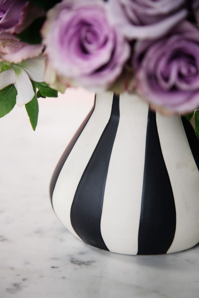 Discover the classic beauty of the rose in our stunning floral design. Up to 35 lavender roses are gathered together with accents of white winter roses placed throughout. Resting inside our new 6” tall ceramic striped vase, overall this arrangement stands around 11” tall. Please note that we may need up to 48 hours in advance for this design.