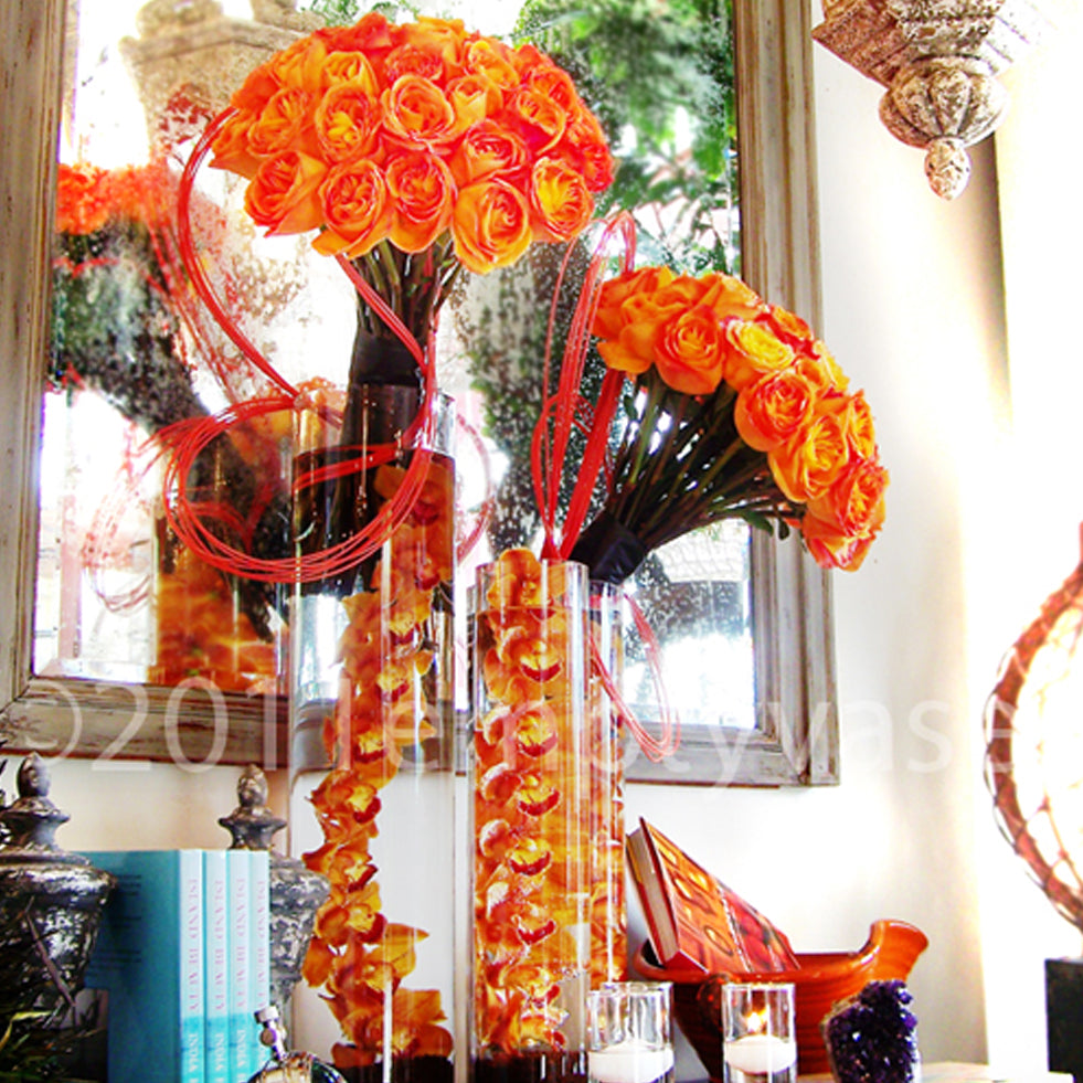 This stunning double design features not one, but two striking arrangements. Each arrangement features approx. 40 orange Cymbidium orchid blooms and 100 - 125 orange roses accented with orange decorative wire in a tall cylinder 26” and 30” glass vase.