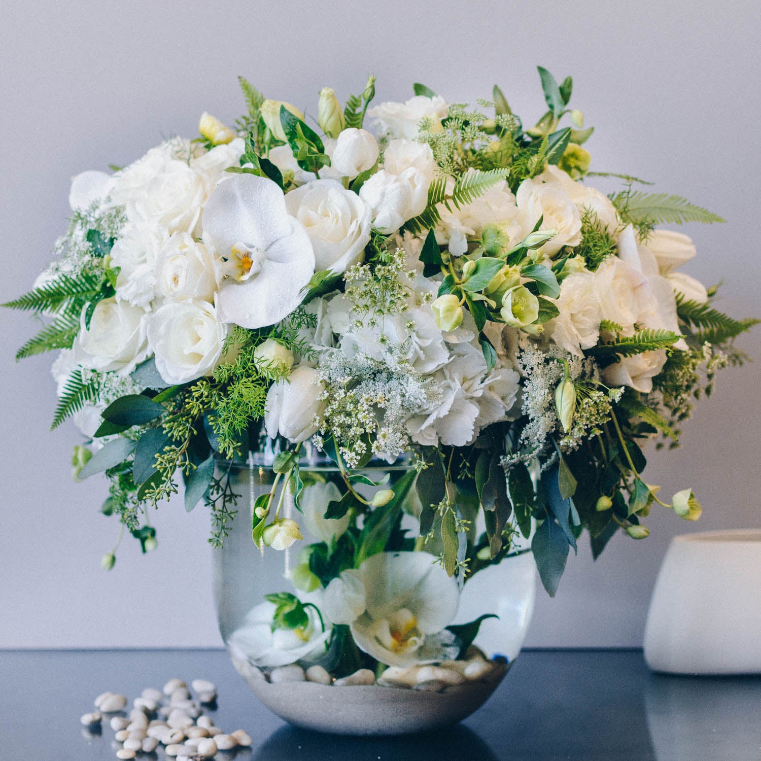 This magnificent design overflows with the natural beauty of the wild. An incredible medley of fresh blooms from crisp white tulips, to pristine white tibetan roses, to delicate mini dahlias, lush patience garden roses, white phalaenopsis blooms, and clouds of white hydrangea create a look of pure abundance. Lisianthus blooms, bunches of queen anne's lace, and a vibrant assortment of wild greenery complete the look. This arrangement offers a two-part design, with the vase housing a work of art in itself. Sand, tan river rocks, and white phalaenopsis blooms can be seen submerged within the 11" by 11" large tapered cylinder vase. Overall, this incredible design stands at approximately 27" wide and 22" tall.