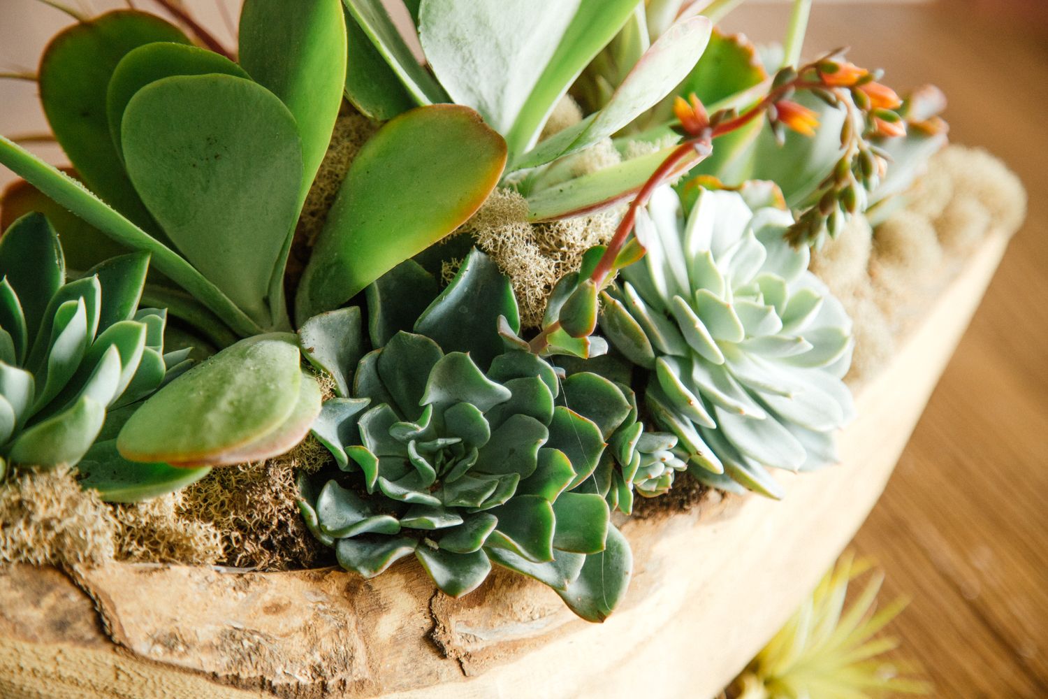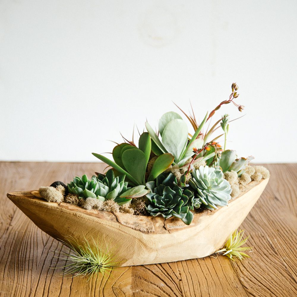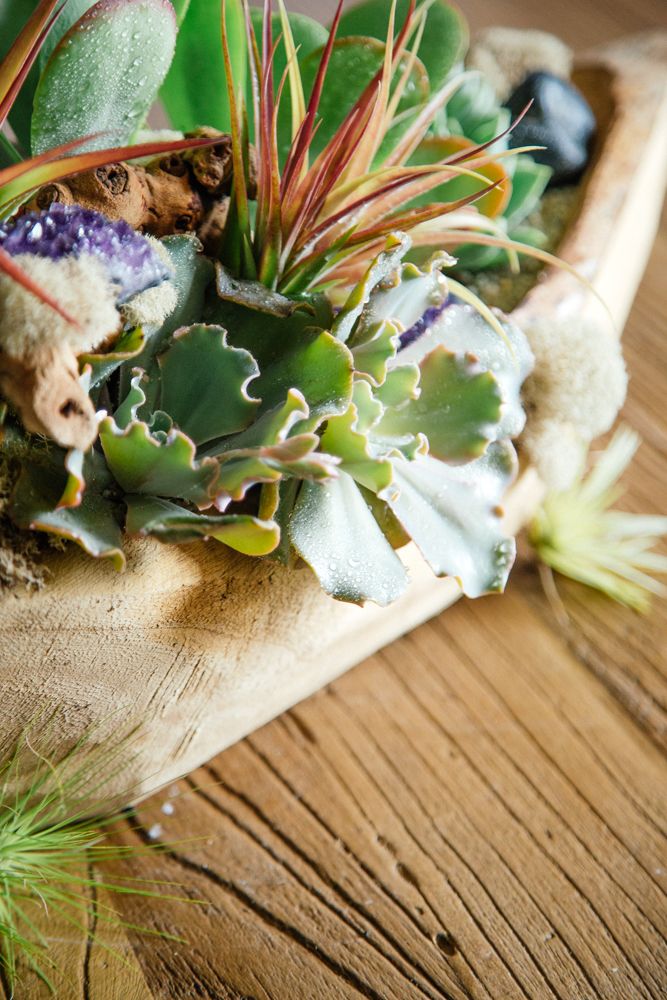 This incredibly unique floral design is sure to offer something both unique and zen to your space. A variety of succulents and airplants are accented by intricately placed reindeer moss and river stone. Amethyst adds the final touch. This arrangement rests inside a hand-carved wooden 5” by 22” vessel.