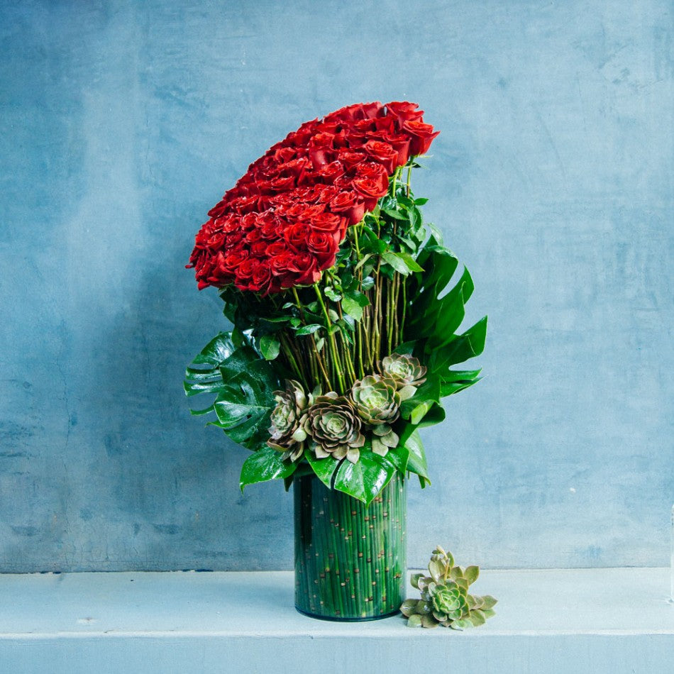 This extravagant floral arrangement will breathe life into any room, with it’s bountiful blooms in royal shades of ruby and emerald. 150 red Roses are intricately sculpted into a base of vibrant Monstera leaves and succulent blooms. Horsetail lines the 10” by 16” glass cylindrical vase. The Royal love stands at 22” to 24” tall overall.
