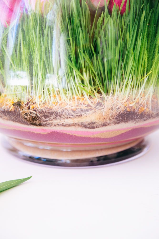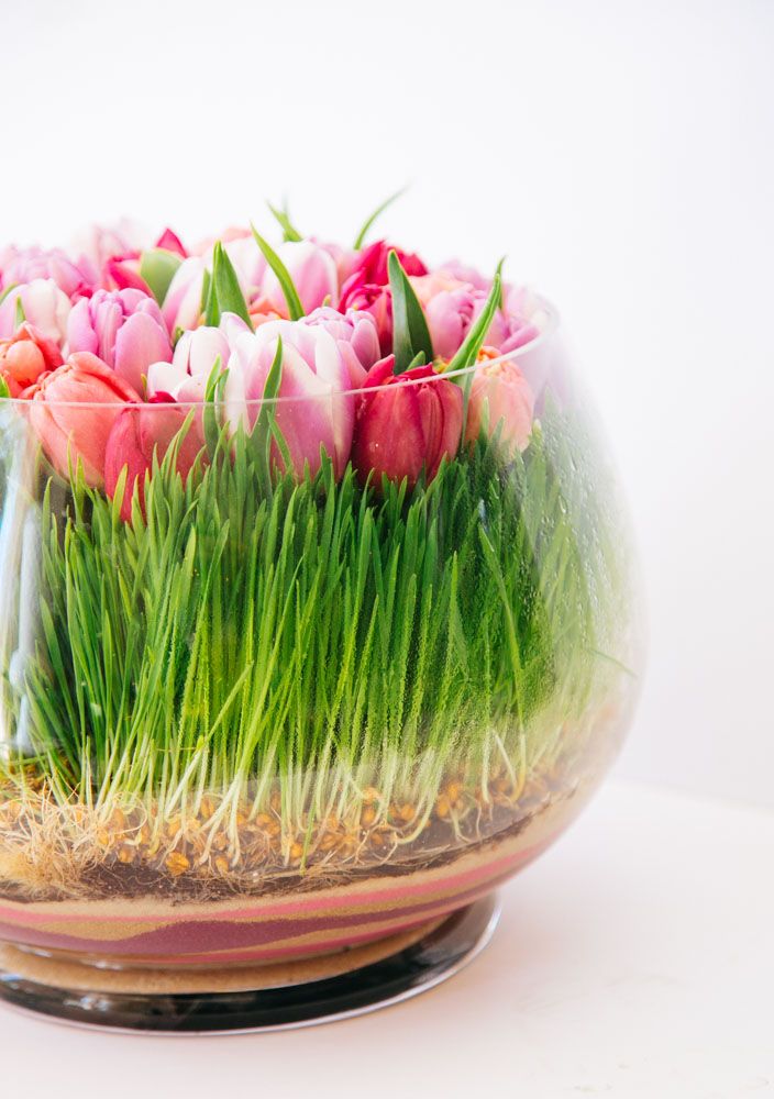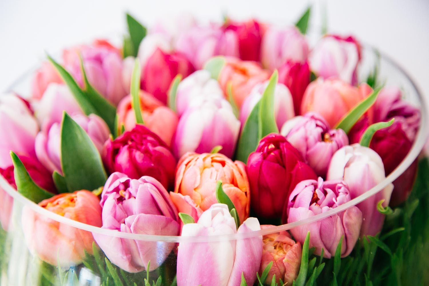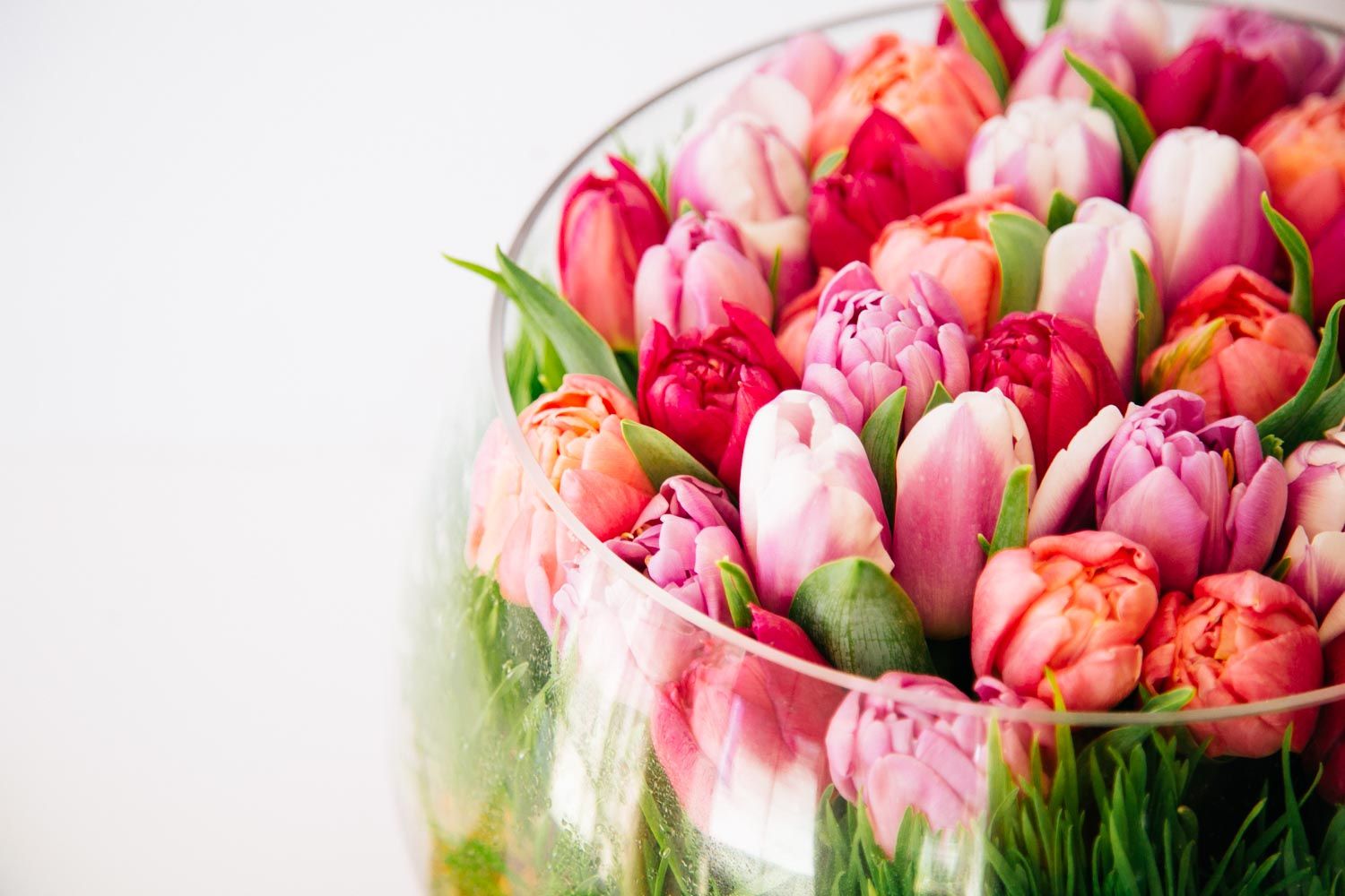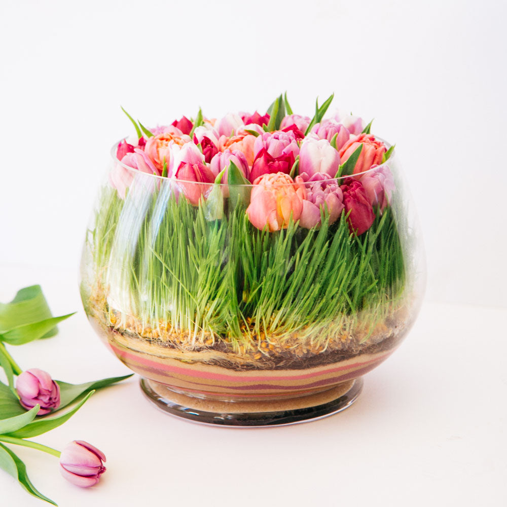 This breathtaking arrangement captures both the essence and colors of spring. 50 stems of Dutch tulips in shades of lavender purple, rich magenta and coral pink are gathered together in the center, resting atop a bed of wheat grass. Resting inside a glass 9" by 12" bell-shaped vase, overall this arrangement stands around 9" tall overall.