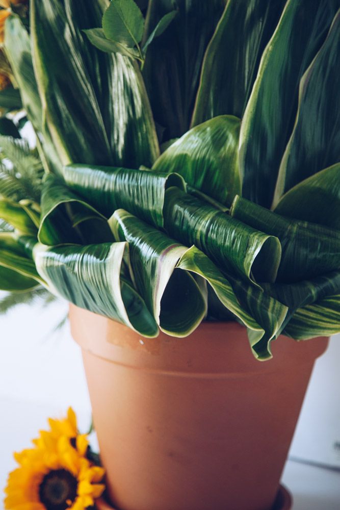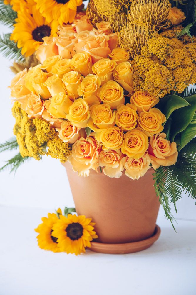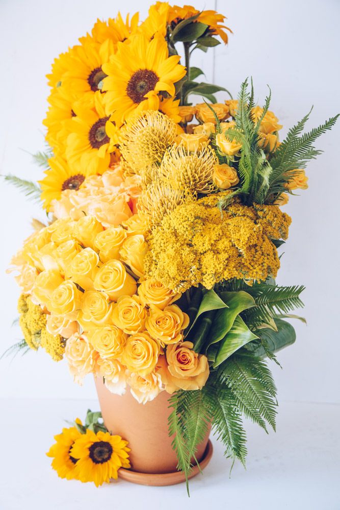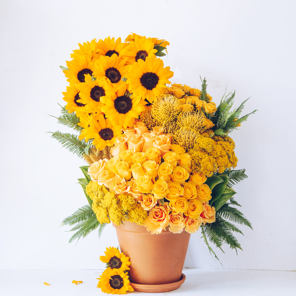 This stunning floral arrangement is lush with sunshine yellow blooms, guaranteeing a happy disposition to fill the air. Sunflowers and pincushion are placed amongst vibrant yaro, baby and spray yellow roses. Amongst the yellow blooms, vibrant green fern is placed throughout. Monstera leaves line the back of the blooms, creating a strong foundation. Resting inside a classic 10” tall orange ceramic garden pot, overall this arrangement stands around 30” overall.