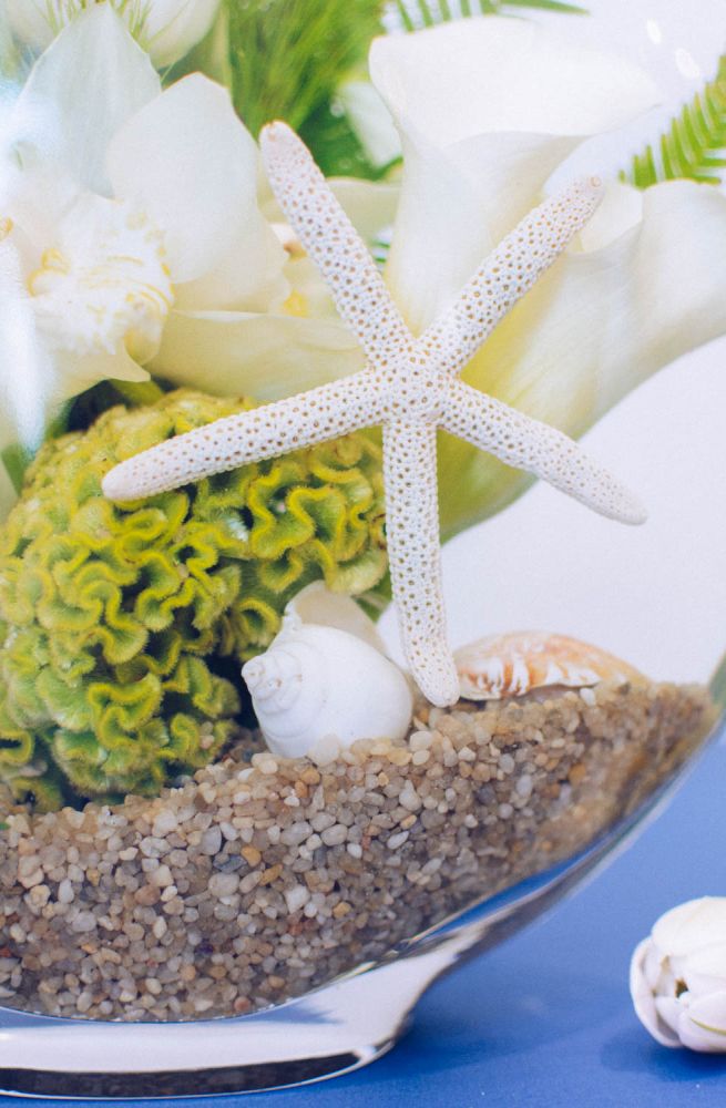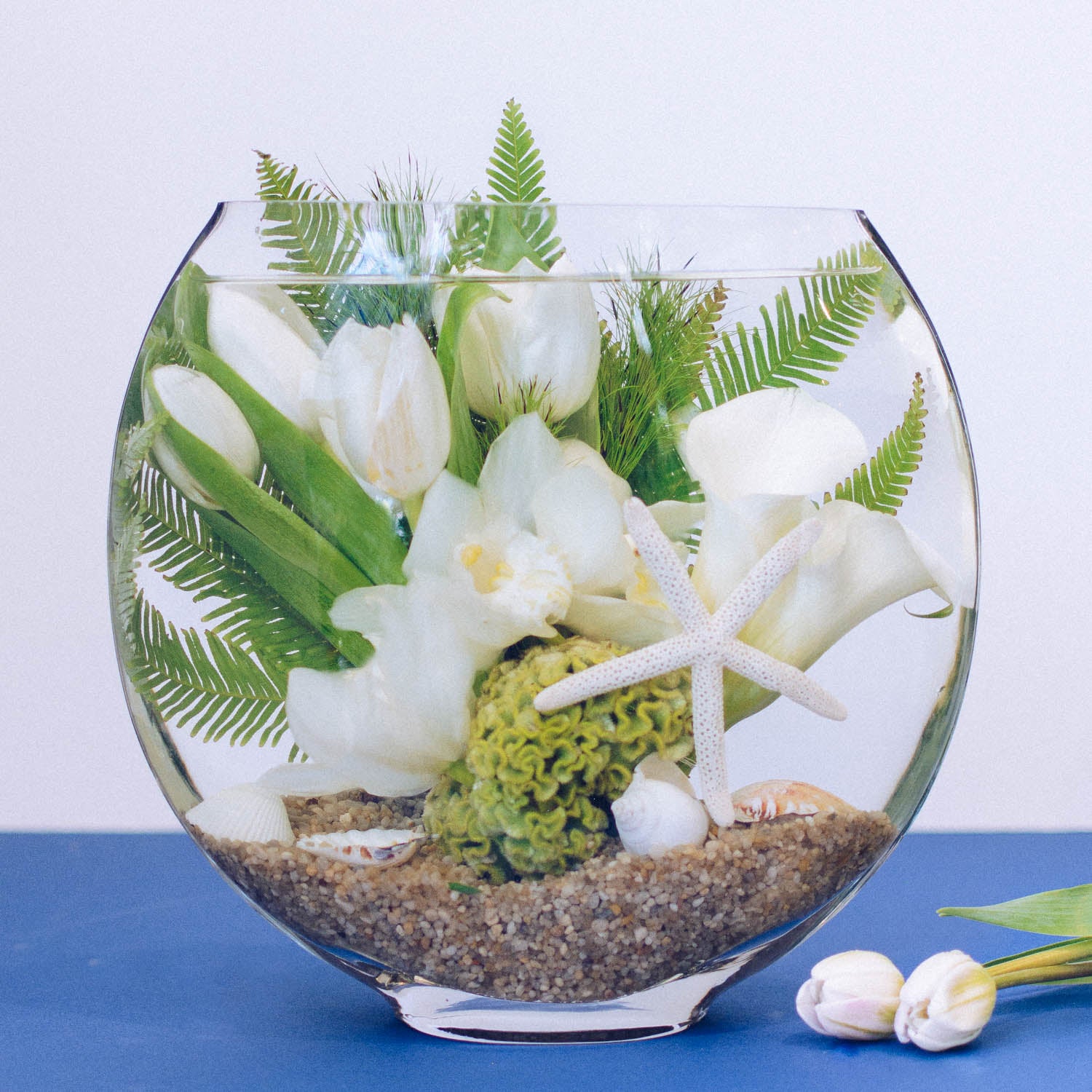 This unique underwater style design features crisp white tulips, calla lilies, and cymbidium blooms. Lime green coxcomb is added to provide the effect of a coral reef, all submerged within the 10" tall by 11" wide glass moon shaped vase with an opening of 8" long and 4" wide.