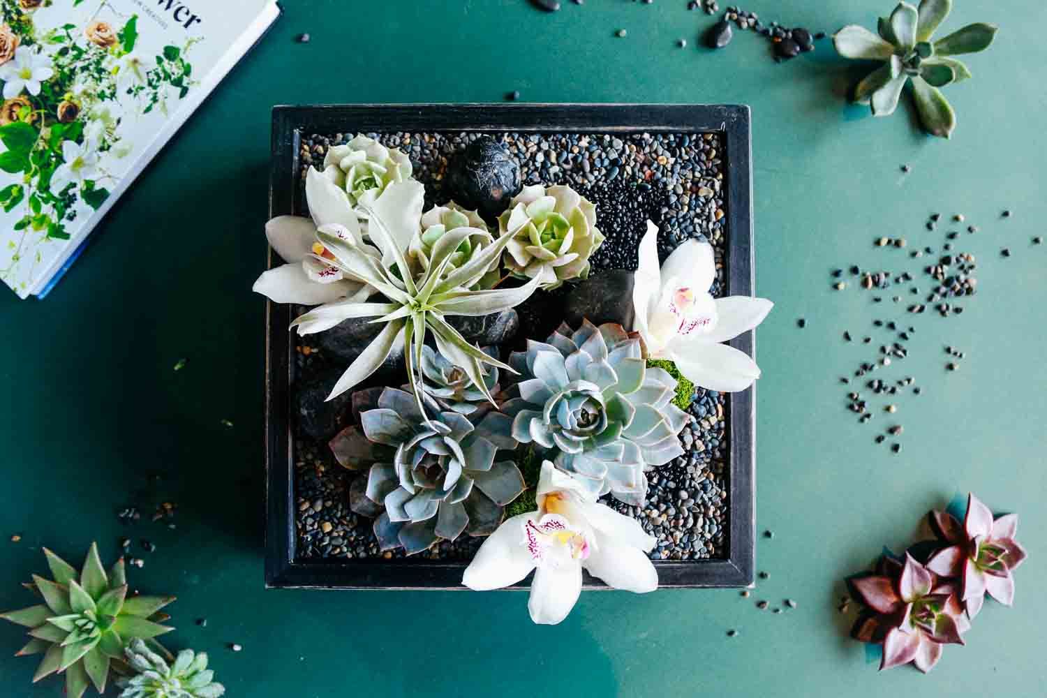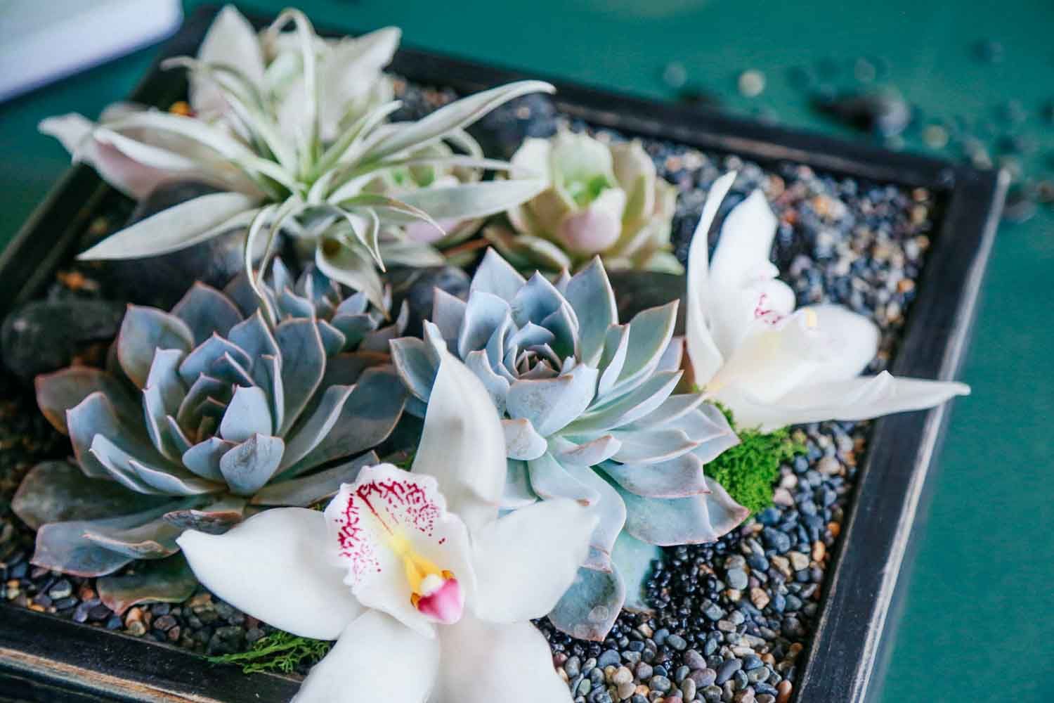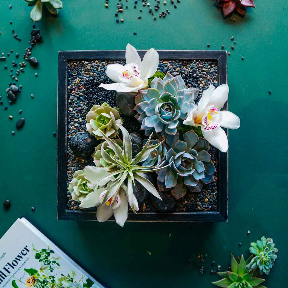 The term Ukiyo derives from the Japanese language, and it translated to “A Floating World”. This timeless arrangement offers up a beautifully composed piece of earth, featuring white cymbidium orchids, succulents, air plants and river rocks. Resting inside a rustic hand-painted wooden box, this arrangement stands 6” tall, and overall measures 12” by 12”.