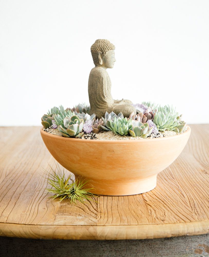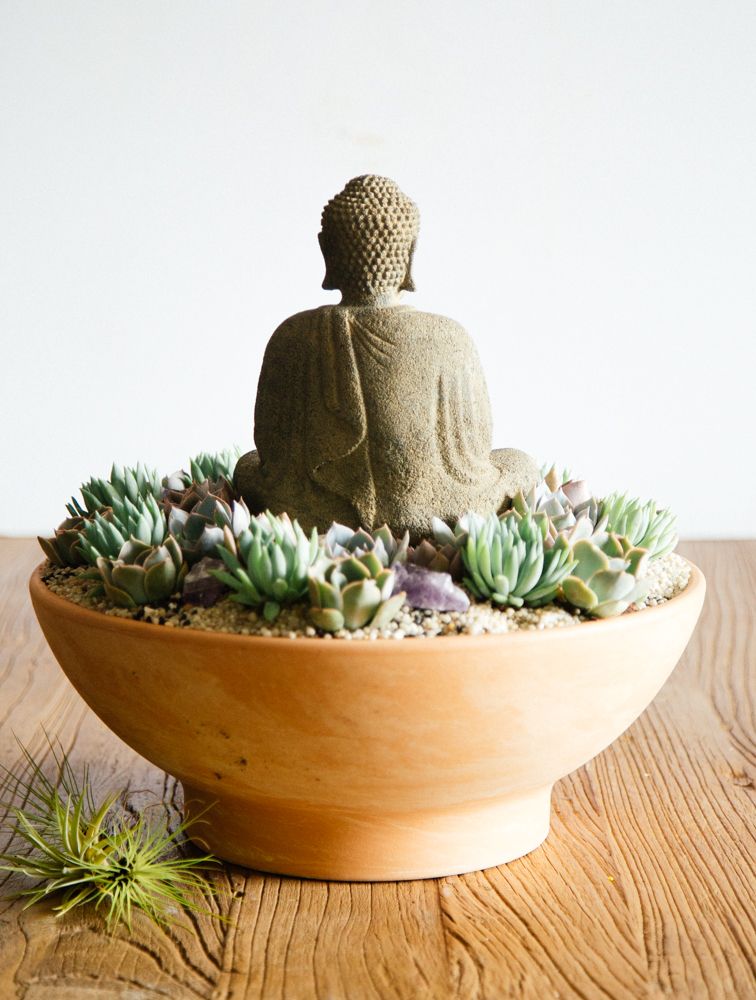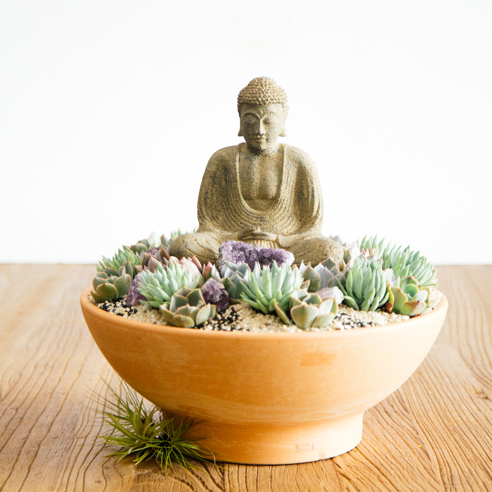 Take a moment to center yourself with this serene and beautiful design. Succulents and amethyst stones are intricately placed atop a bed of earth-tone pebbles. A rustic stone Buddha is placed in the center, adding the final touch. Resting inside a 7” by 18”orange ceramic pot, overall this arrangement stands around 15” tall.