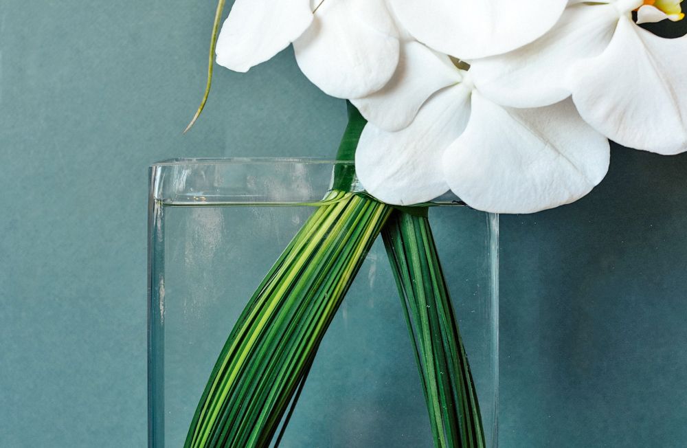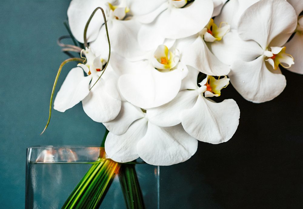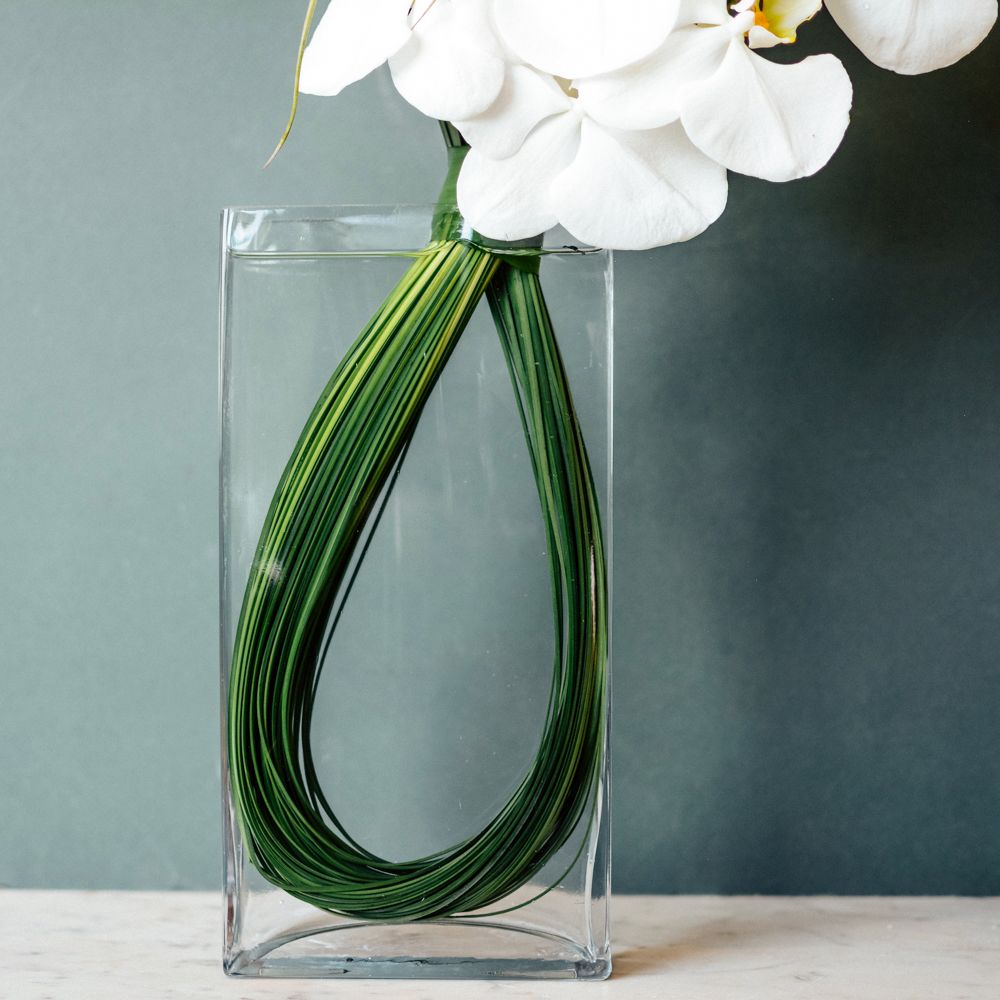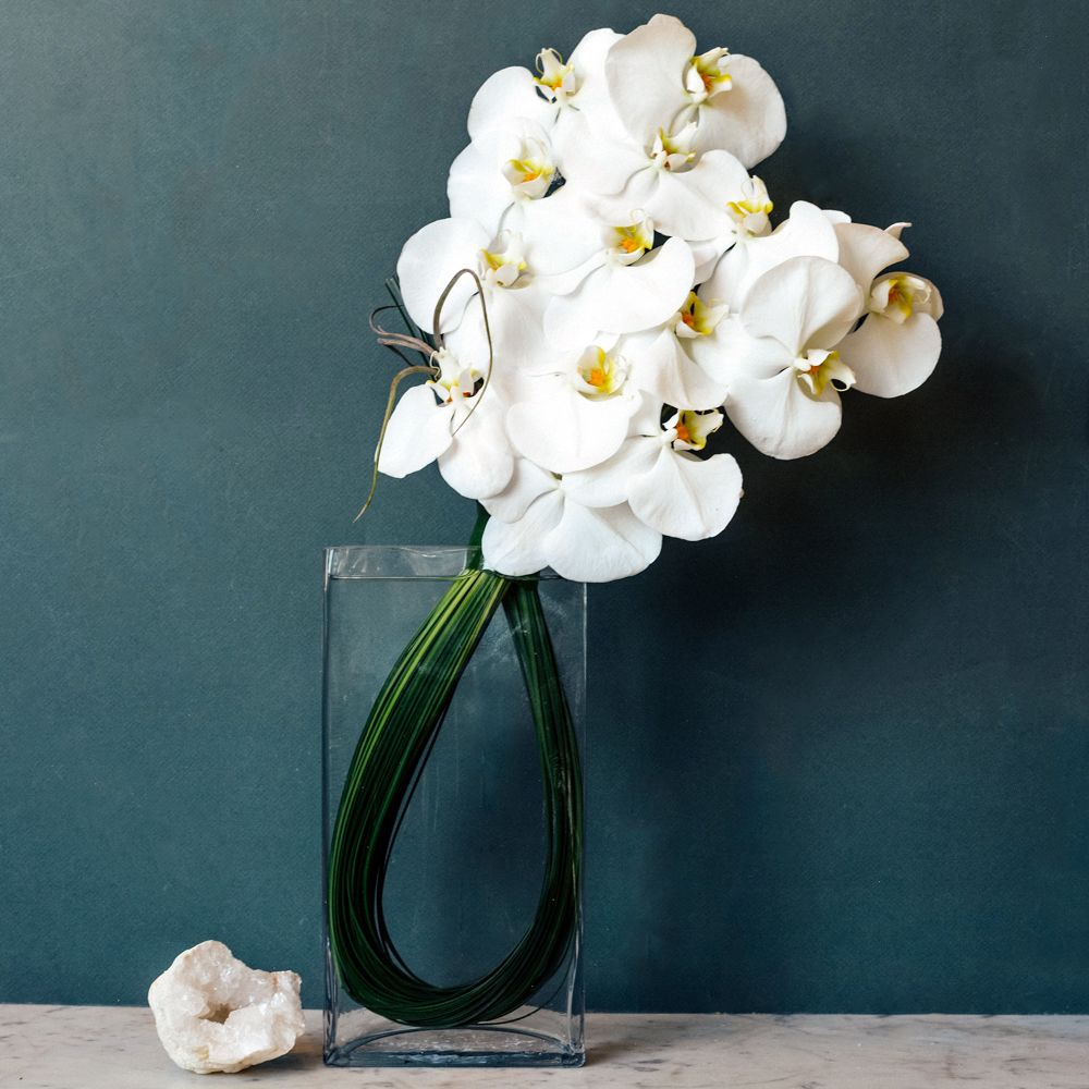 Modern yet timeless, this beautiful floral arrangement features crisp white phalaenopsis orchids resting opposite of an air plant. Steel grass in brilliant green twines together, holding the orchid blooms and submerged within the 8” rectangular glass vase. Overall, this arrangement stands 14” tall.
