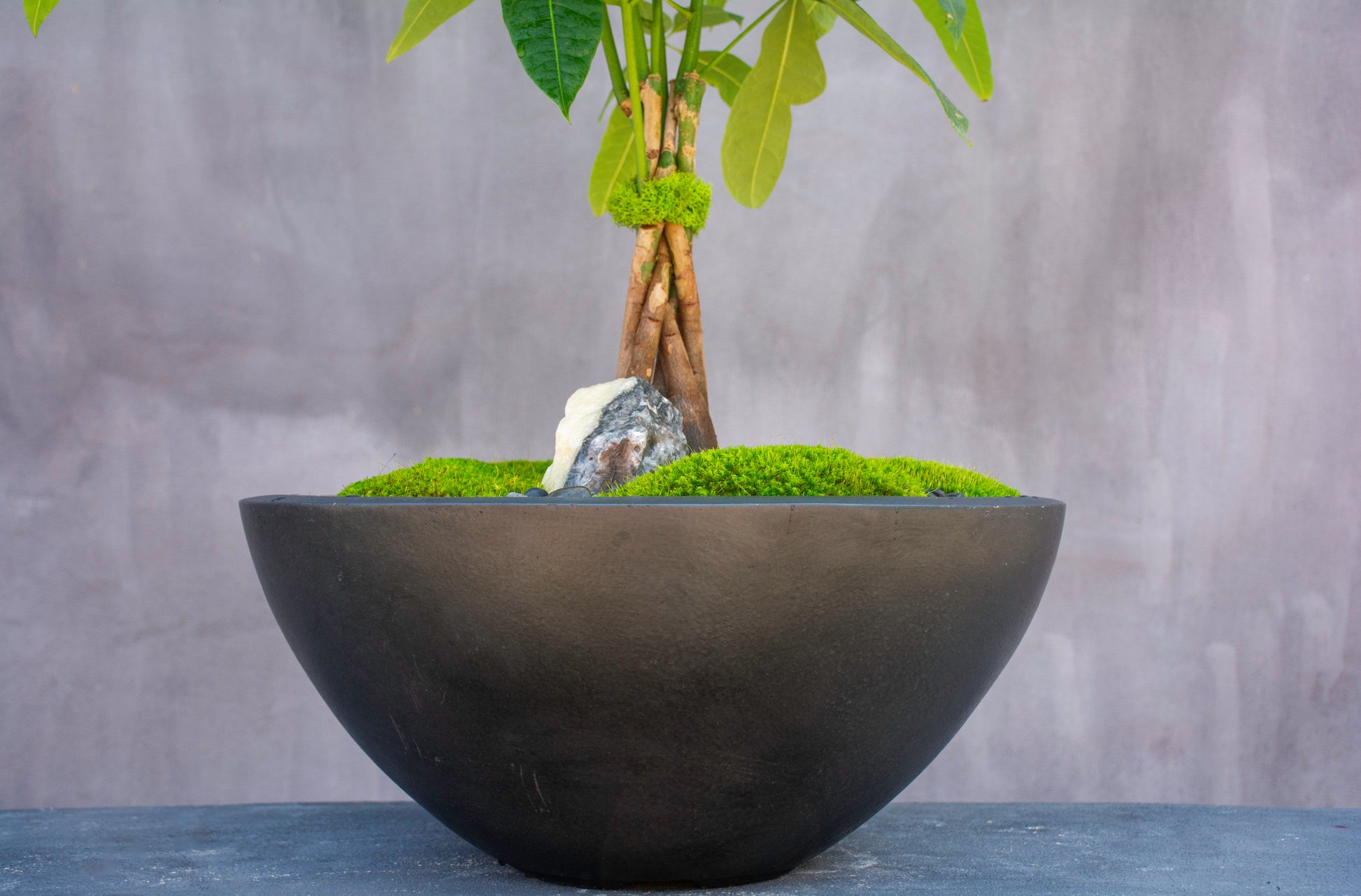 This beautifully braided Money Tree (Pachira Aquatica) thrives indoors with medium to bright indirect light. It prefers deep but infrequent watering. The base of this lush tropical plant is artfully accented with vibrant green moss puffs and sleek black pebbles, while a mineral crystal stone adds the perfect finishing touch. The entire arrangement is presented in a smooth black stone bowl exclusively designed for Empty Vase.