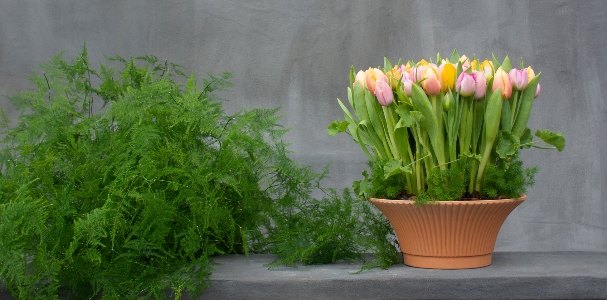Like a dreamy spring garden captured in full bloom,50-55 Tulip Meadow brings the beauty of nature indoors. Soft pastel tulips shoot up gracefully, their exposed stems evoking the charm of fresh-cut flowers in the wild. Nestled in a warm terra cotta pot, the arrangement is accented with airy ming fern, delicate trailing ivy, and natural wood chips for an enchanting, just-planted effect. A celebration of renewal and effortless beauty, this design is perfect for bringing a breath of fresh air to any space.