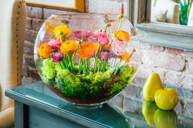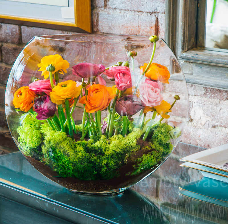 This beautiful arrangement looks as though a private garden was placed inside a round vase. 18 Ranunculus seem as though they’re planted, in various shades of spring such as yellow, orange and fuchsia. Sitting on a bed of moss and brown sand, this floral design lets one see everything. This arrangement sits inside a round glass vase, which stands 14” tall and 16” wide.