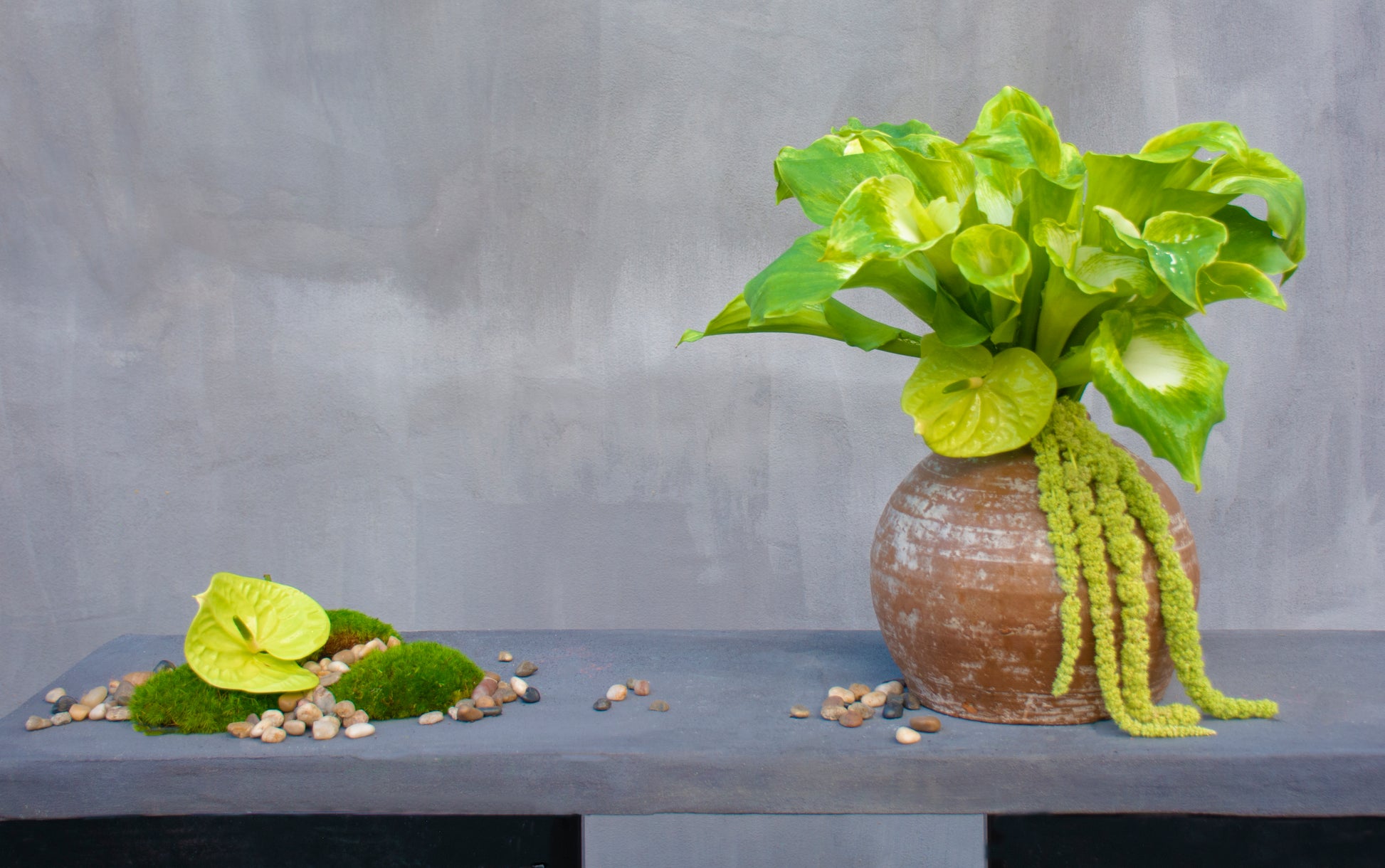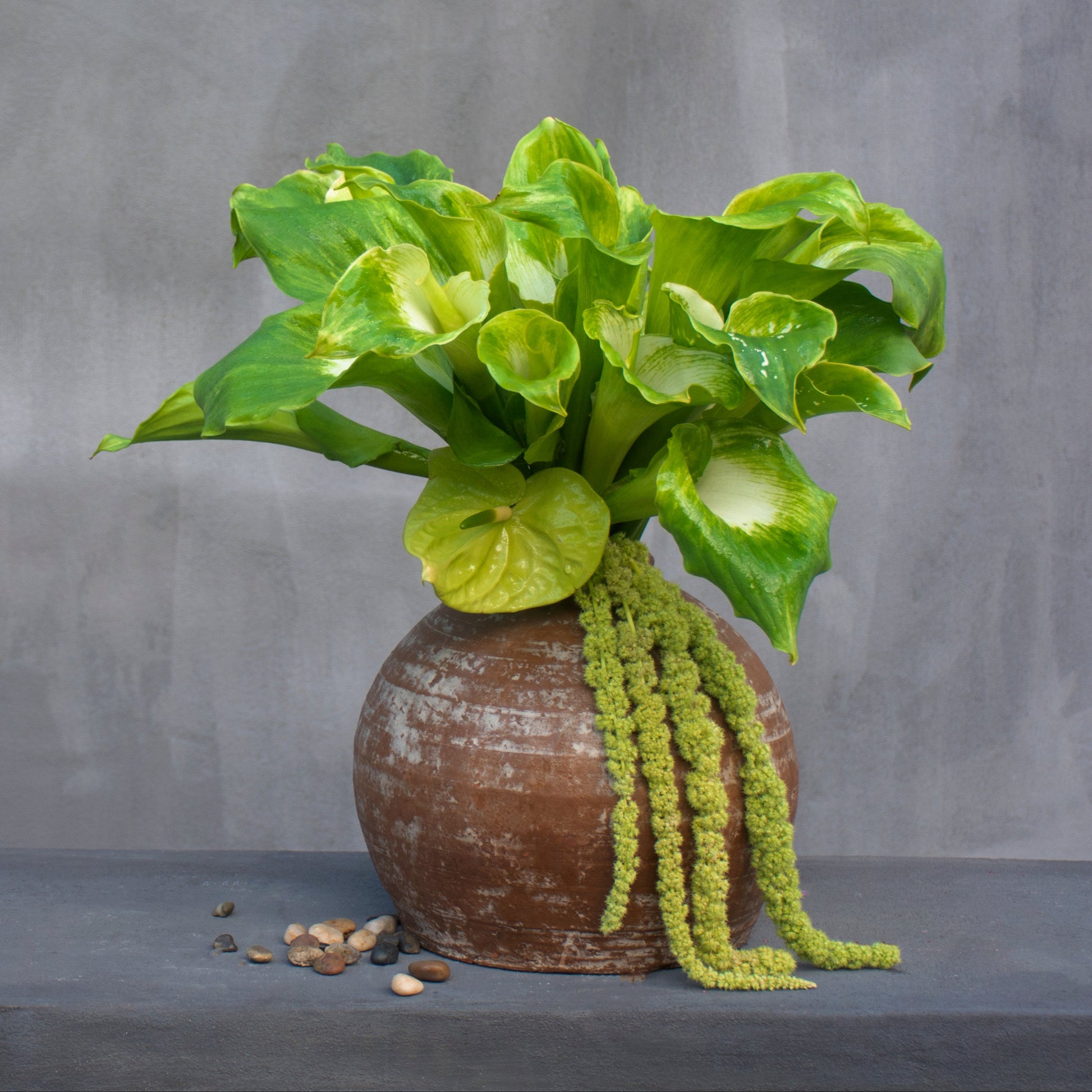Green calla lilies rise with effortless grace, while a singular anthurium lends its sculpted silhouette. A delicate trail of amaranthus spills over — a whisper of movement to complete this tranquil composition. All nestled in a rustic brown vessel, where earth meets elegance.