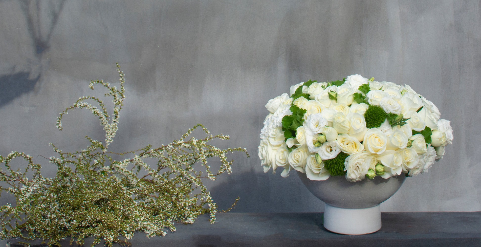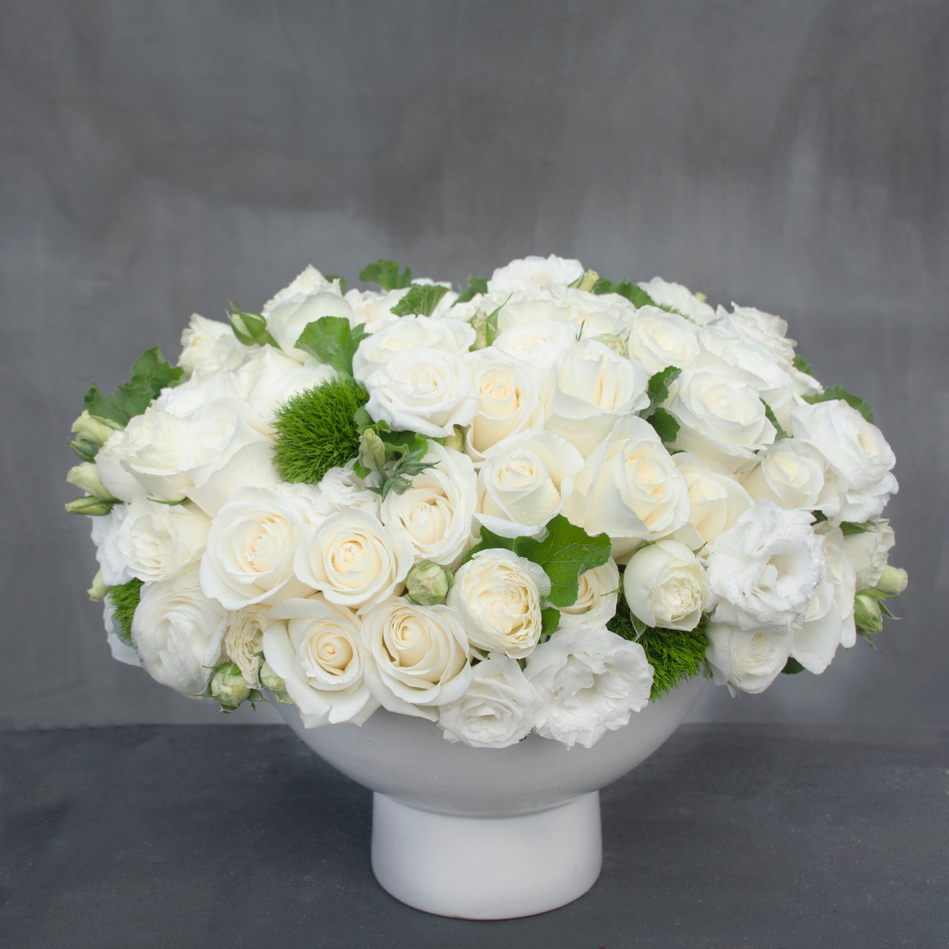 Immerse yourself in the serene beauty of our all-white arrangement. Dozens of pristine white roses and delicate lisianthus blooms are artfully gathered in a pave style, with a subtle whisper of green dianthus adding a touch of unexpected texture. Standing at 11 inches tall and spanning 17 inches wide, this sophisticated display brings an air of timeless elegance to any space in a pedestal white vase.