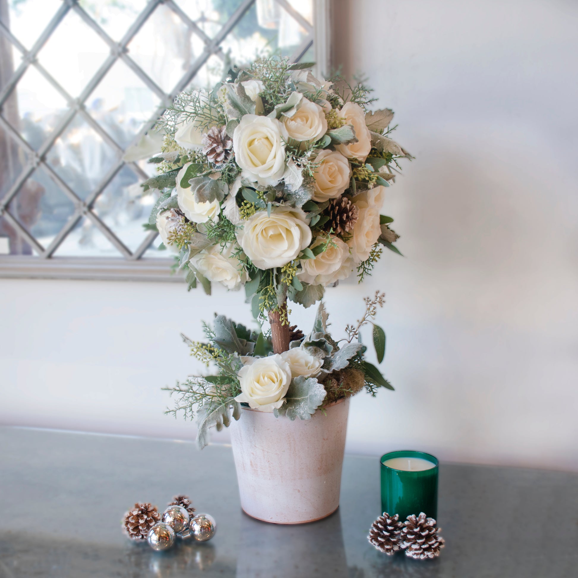 Indulge in the enchantment of a pristine white topiary graced by velvety white roses, lush greens, winter foliage, and frosted pinecones. A touch of elegance is added with shimmering silver Christmas ornament balls. Standing tall at 22 inches and boasting a width of 11 inches, this topiary exudes a captivating presence.