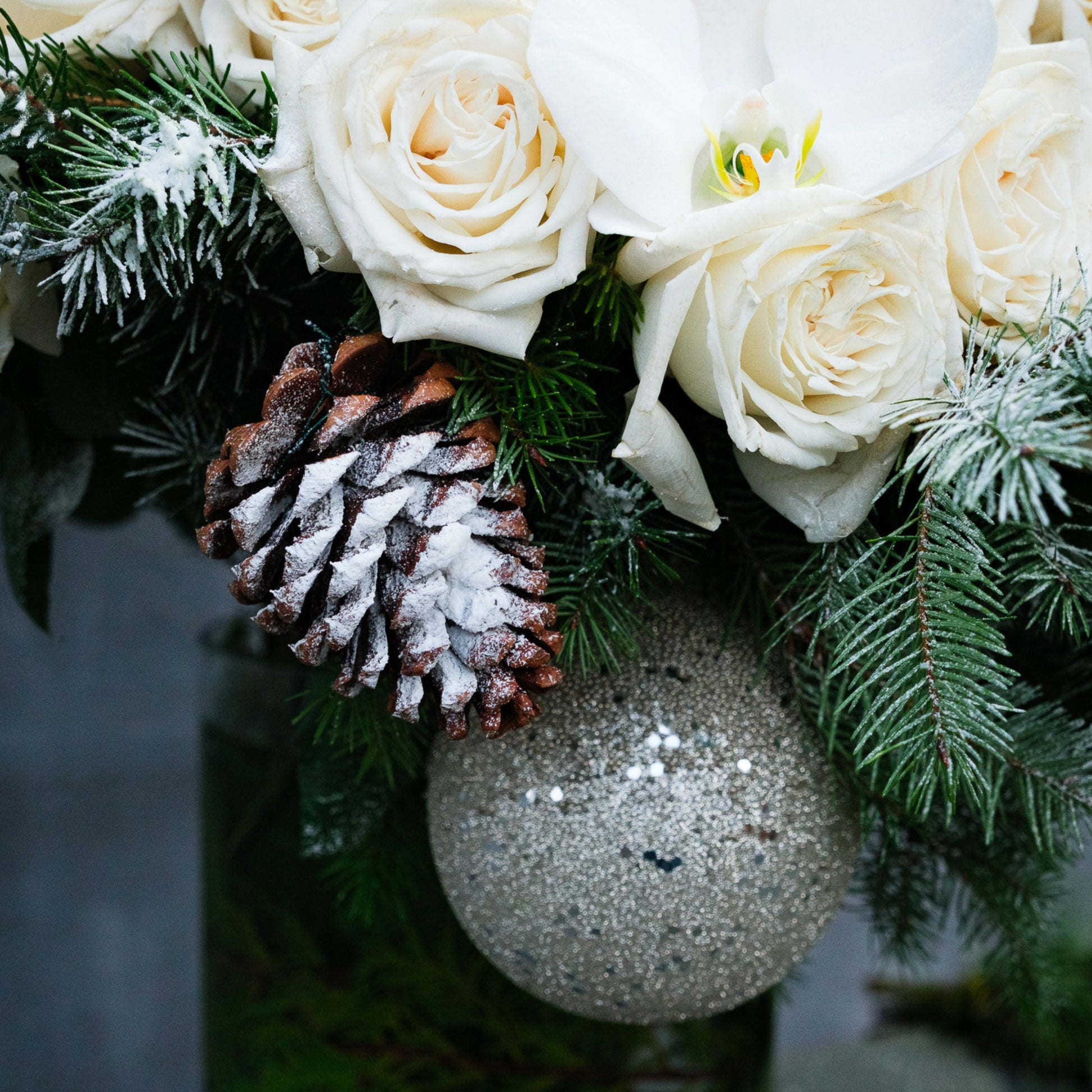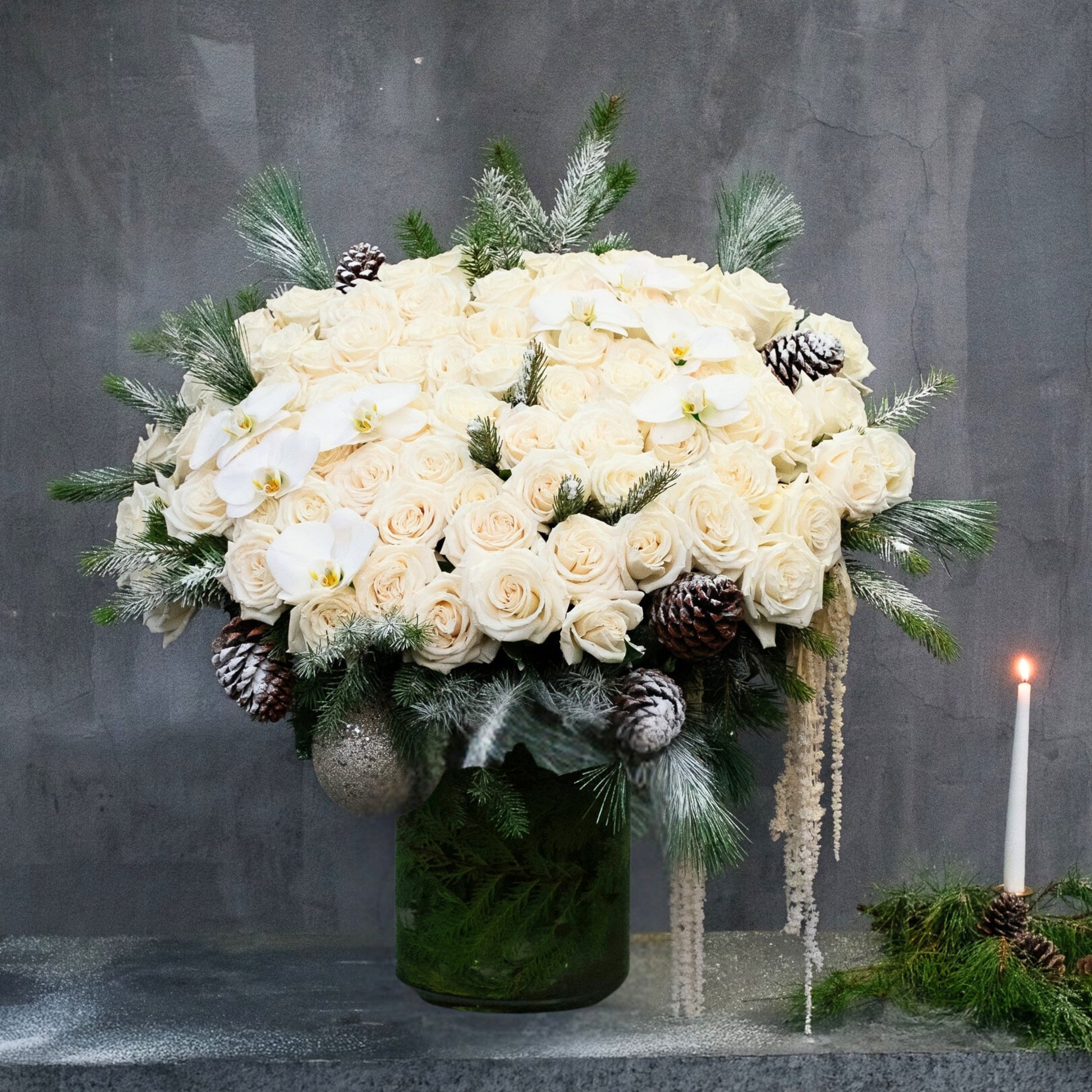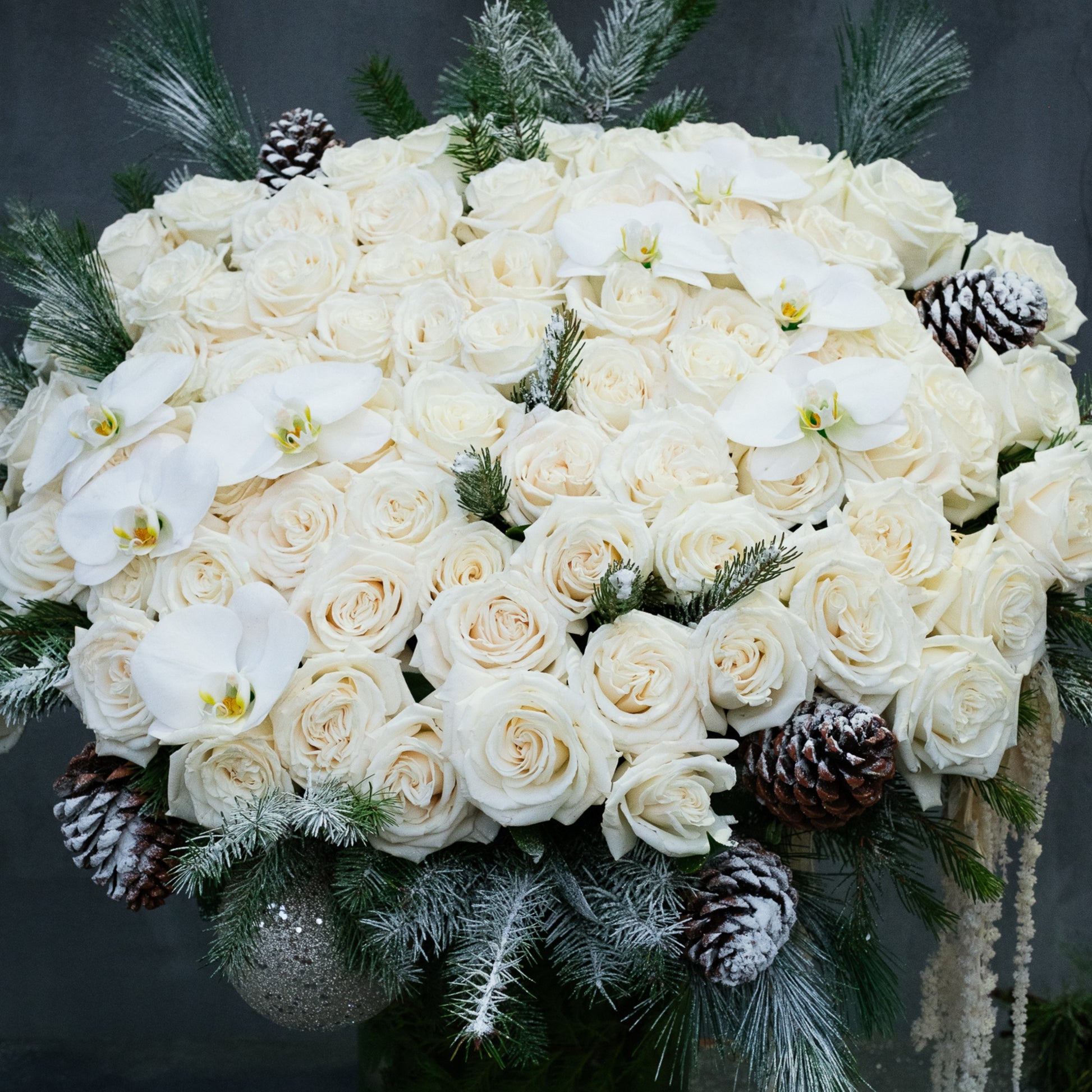 At its core, the composition features a clouded canopy of premium white roses, 50 roses in the Petite version and 75 roses in the Grande version, creating a full, domed silhouette with soft curvature and tonal depth. Woven between the blooms, iced pinecones and frosted winter greenery introduce cool texture and natural contrast. Cascading ivory amaranthus drapes along one side, adding movement and elegance, while hints of phalaenopsis orchid blooms.