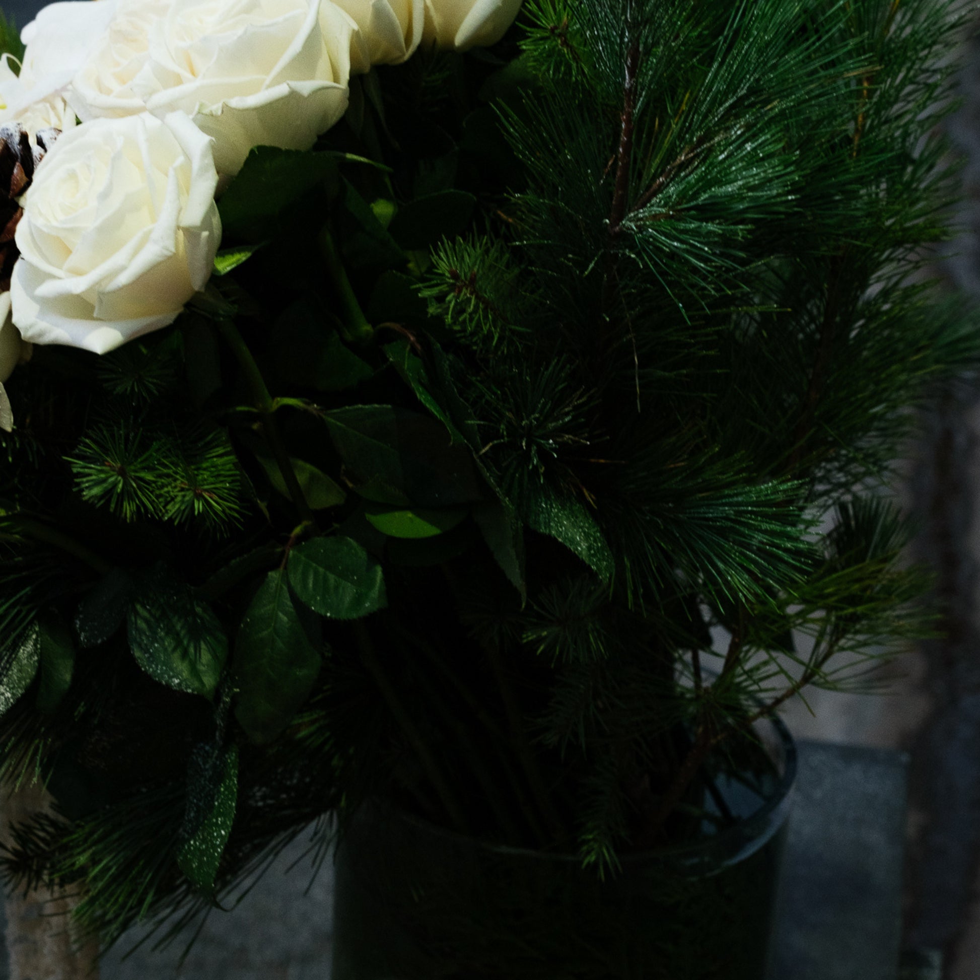 Please note: Each Winter Blanc arrangement is handcrafted with fresh winter greens and natural pinecones. Subtle variations in tone, snow-texture, and placement are part of the design’s unique artistry.