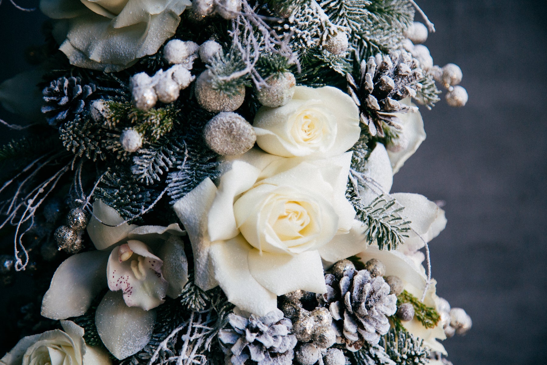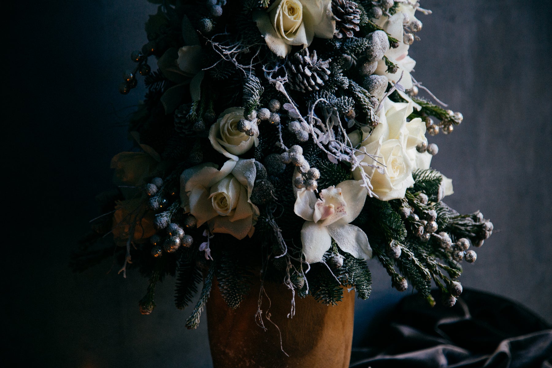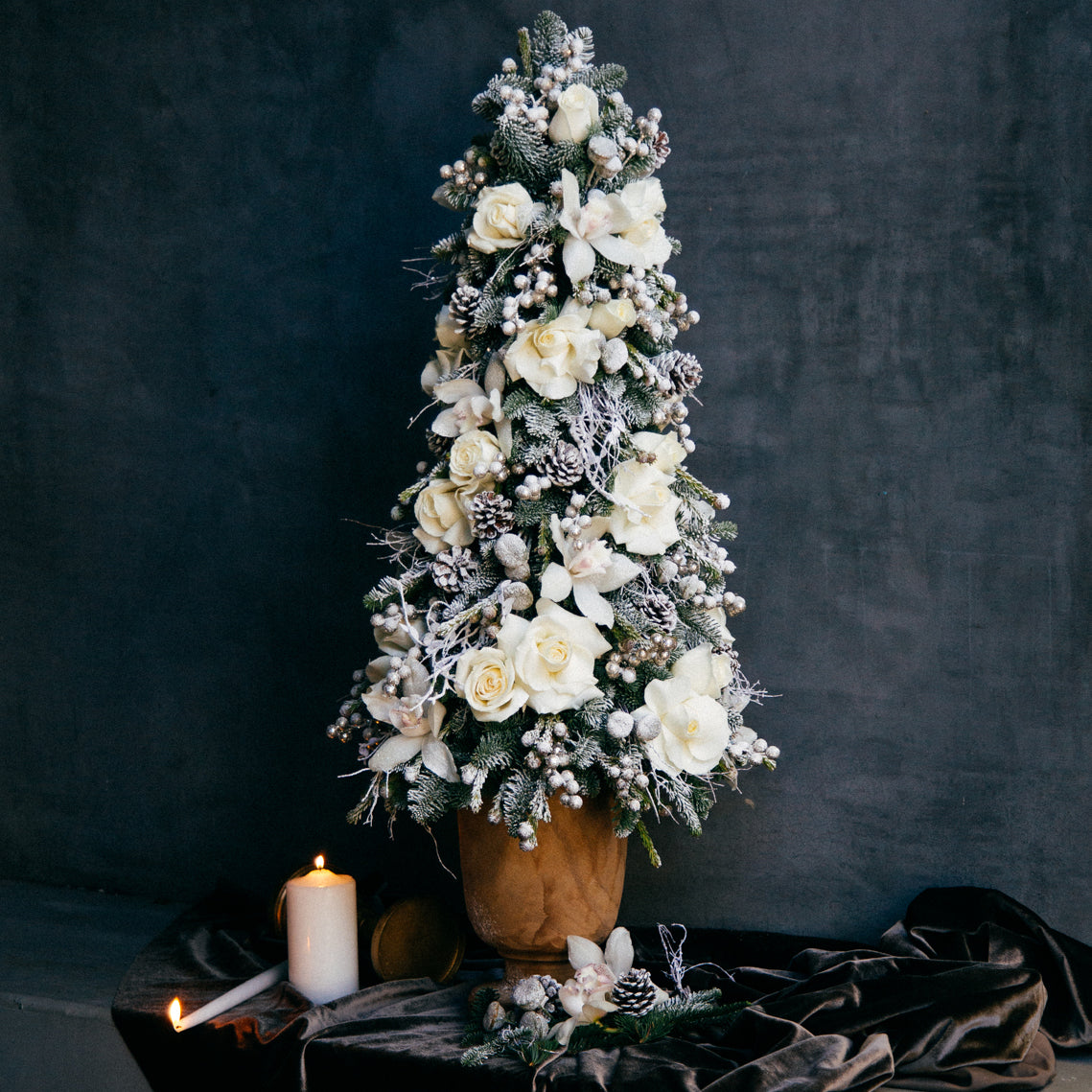 Immerse yourself in the enchanting frost and dew of a winter morning with our captivating topiary tree arrangement. Delicate white roses and frosted pinecones are meticulously placed among the pine branches, while accents of orchids and frosted winter berries provide the perfect finishing touch. Elevated in a 12” tall pot, this stunning arrangement reaches a majestic height of approximately 36 inches.