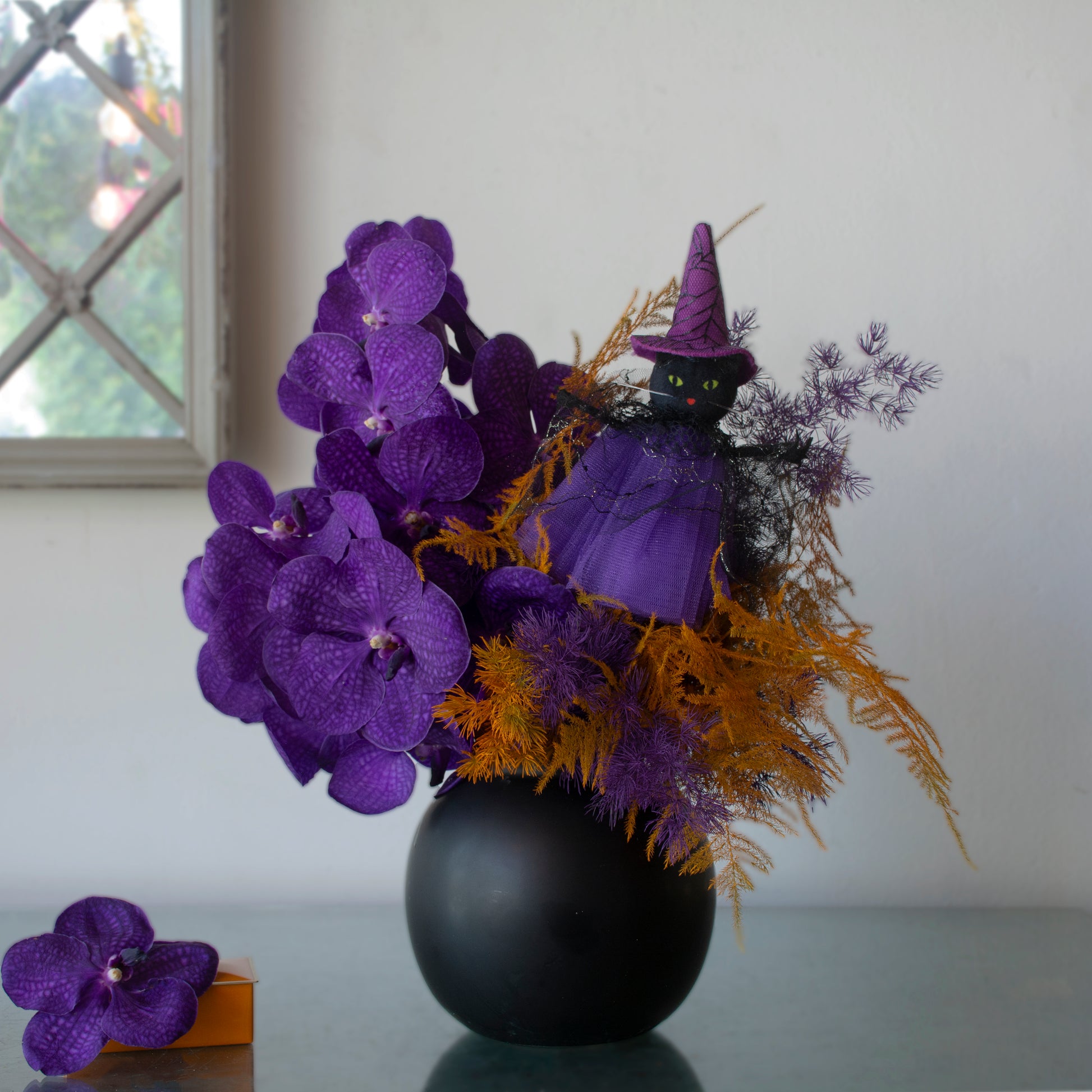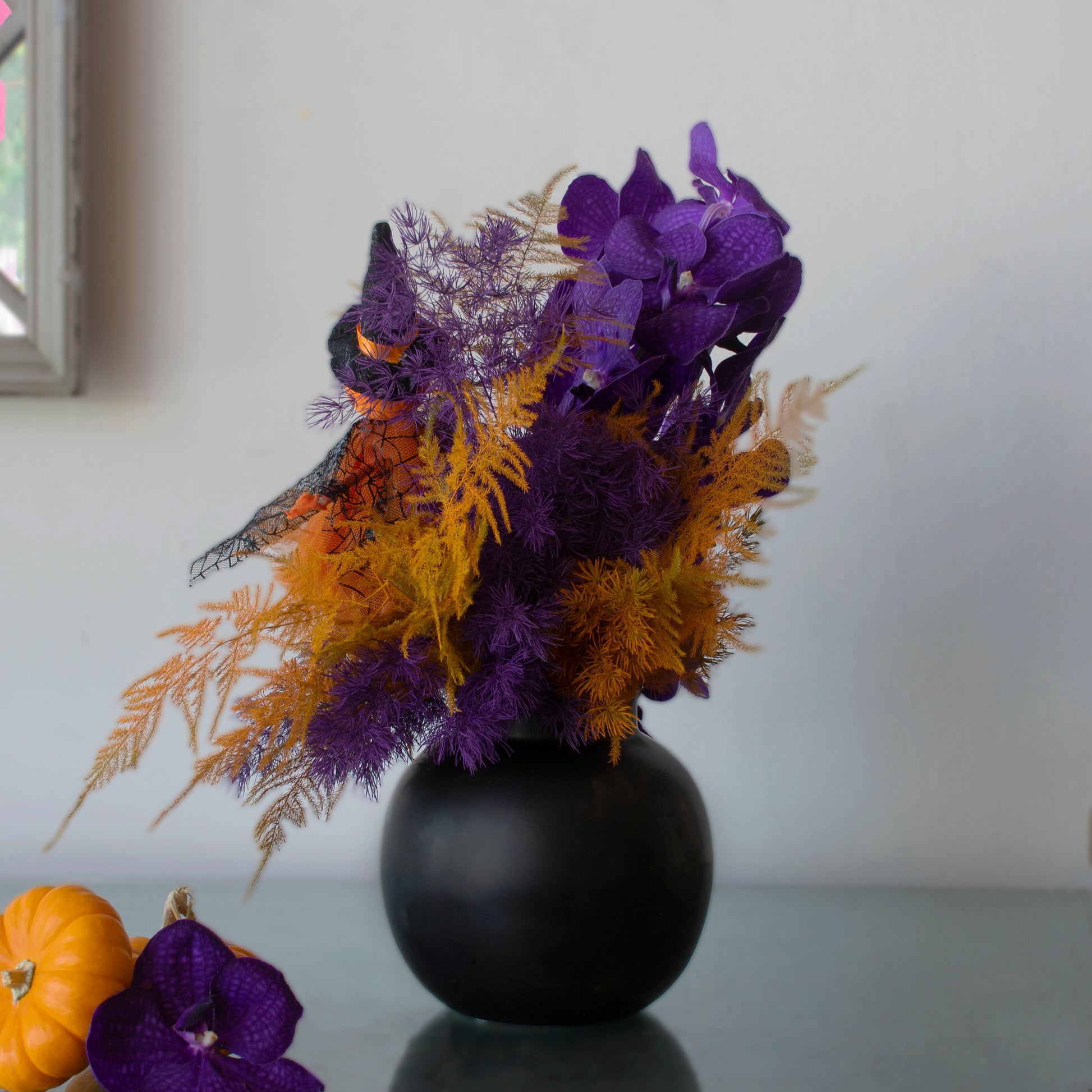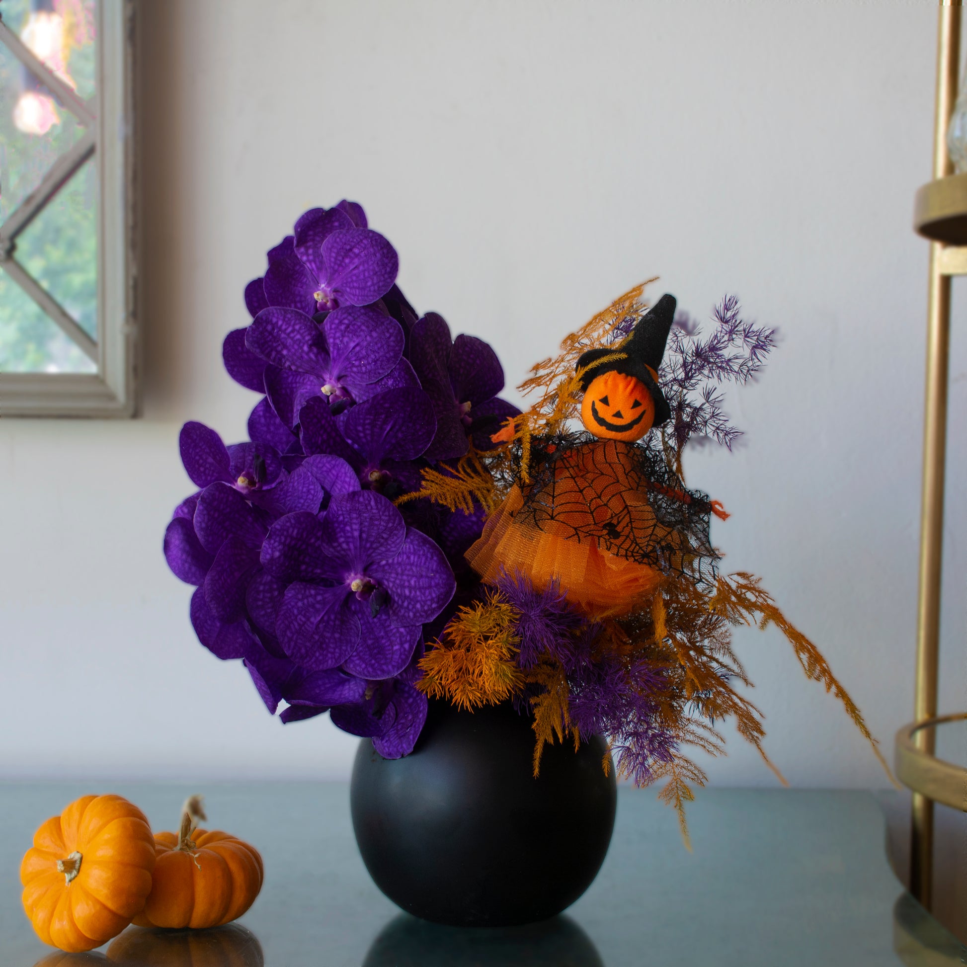 Conjure the spirit of the season with our enchanting Witch's Cauldron. Two elegant stems of purple Vanda Orchids emerge from the cauldron, accented by spidery deep purple Ming Fern and fiery orange Plumosa Fern. Adorned by a charming pumpkin witch ornament, this arrangement adds a playful yet sophisticated touch to your Halloween décor. This spellbinding statement piece stands at 15 inches tall and 11 inches wide.